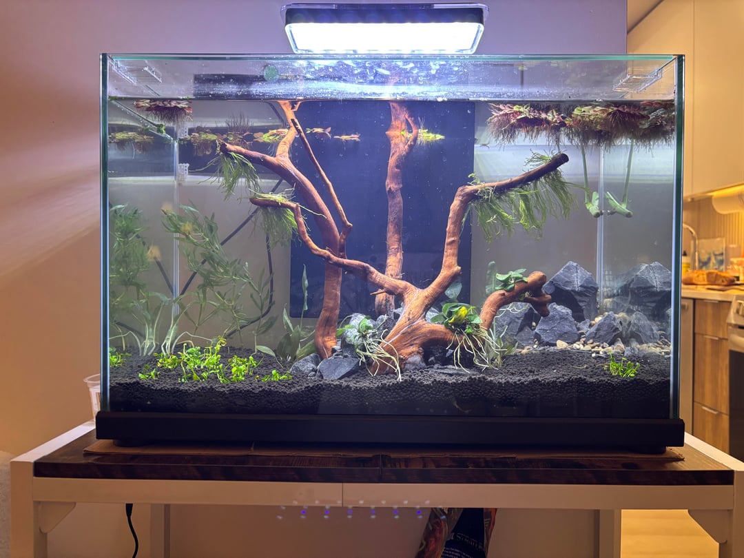 Cycling this 10gallon with plans of adding a plakat betta. I have a monstera propagating in the corner and hope the roots will make a perfect hidey cave. Also hoping the moss will start to grow up towards the surface and hide the glue I used to affix it. I have catappa leaves and Iāll eventually add one. The filter and heater are in the back black container, the water flow is adjustable.