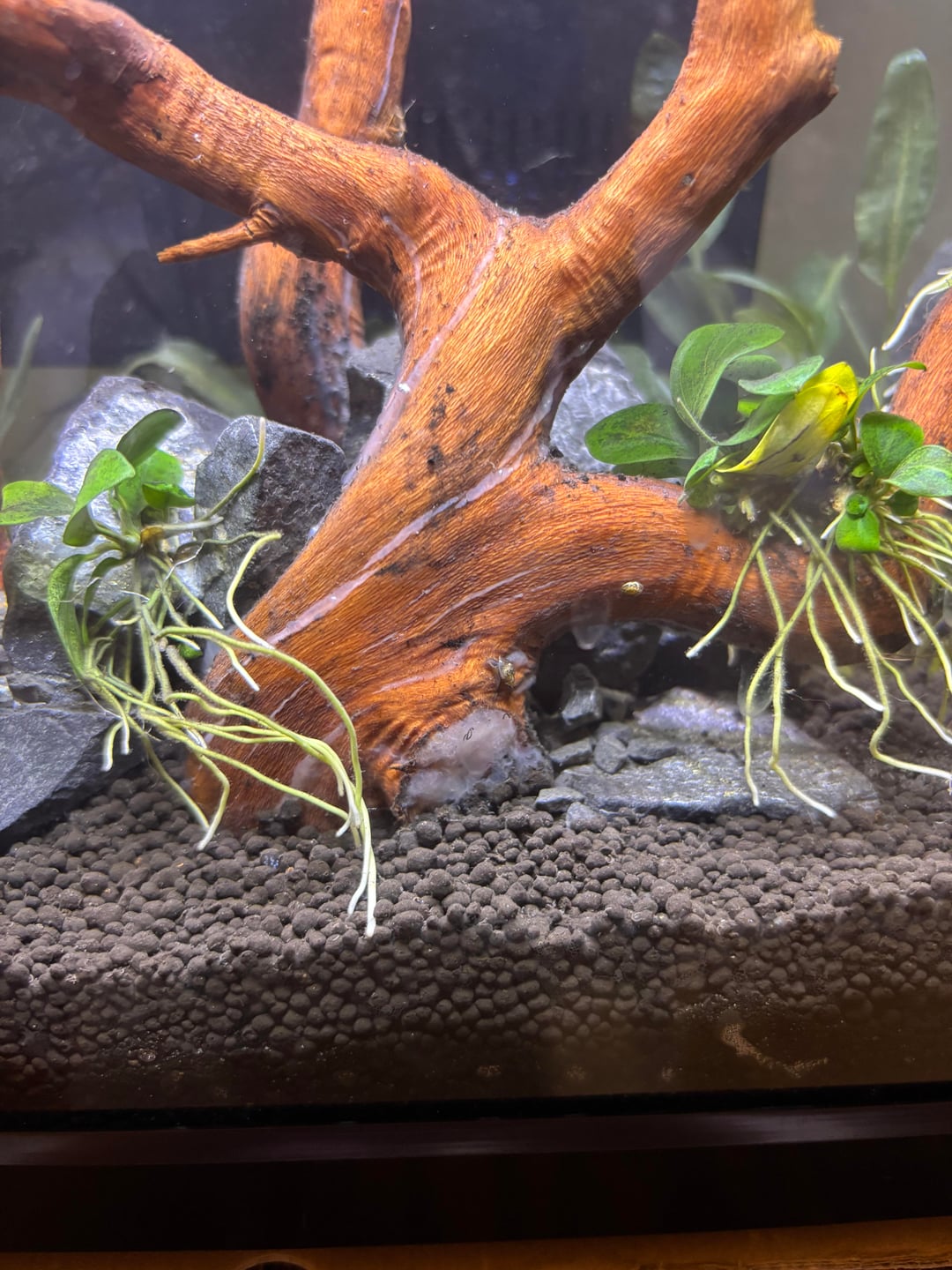 This isnāt the first planted tank Iāve cycled but I think itās the first time Iāve seen this white stuff on my hardwood. Why is it only in certain spots? Itās algae, right? I just added some filter media from an established tank so Iām hoping that goes away soon.