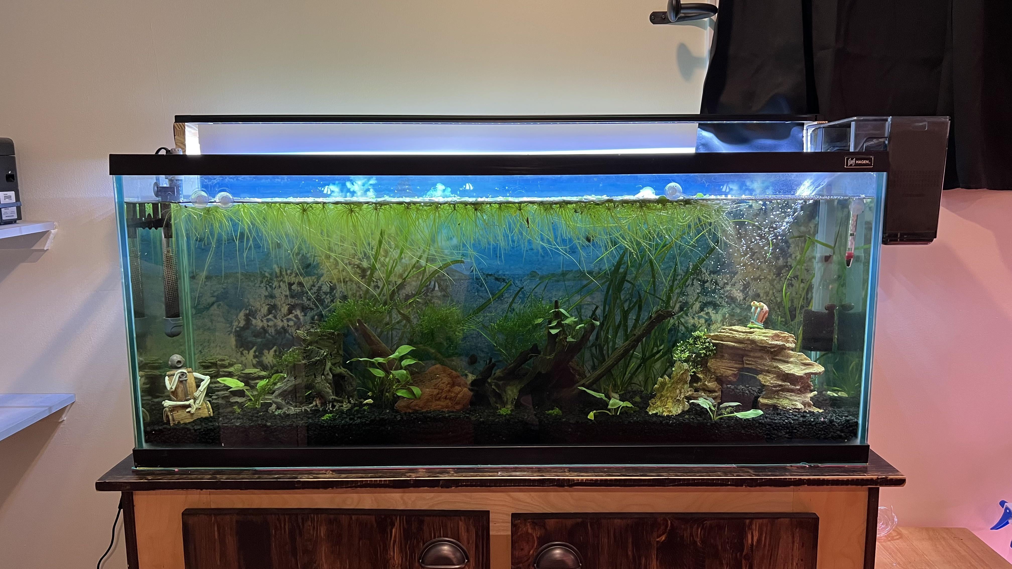 55 gallon tank, set it up in October, only have amano, cherry shrimp and nerites in there currently but some nice community fish getting added soon! Posted by RE-B00T