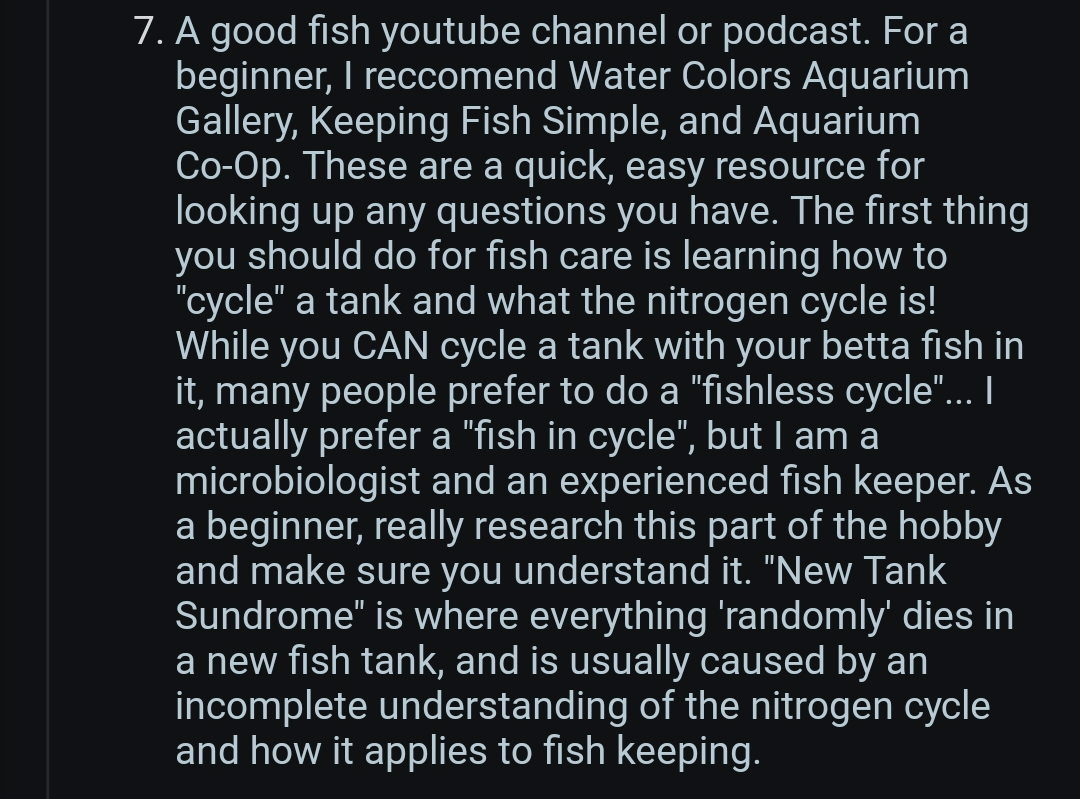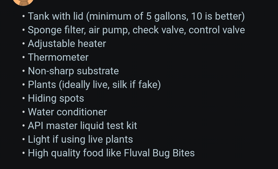 After coming home I immediately binged betta care and went shopping. The lists above are what I referred to. Got a 10 gallon tank, fish food, heater and thermometer, filter, substrate, plants (real and fake), SpongeBob themed hiding spots, water conditioner, bacteria grower, testers, light, few decorations, API testers, cleaning supplies, and emergency medicine. I have a small fish tank because I wanted fish when I was 10 (didn't go well) that I can use in case of emergency.