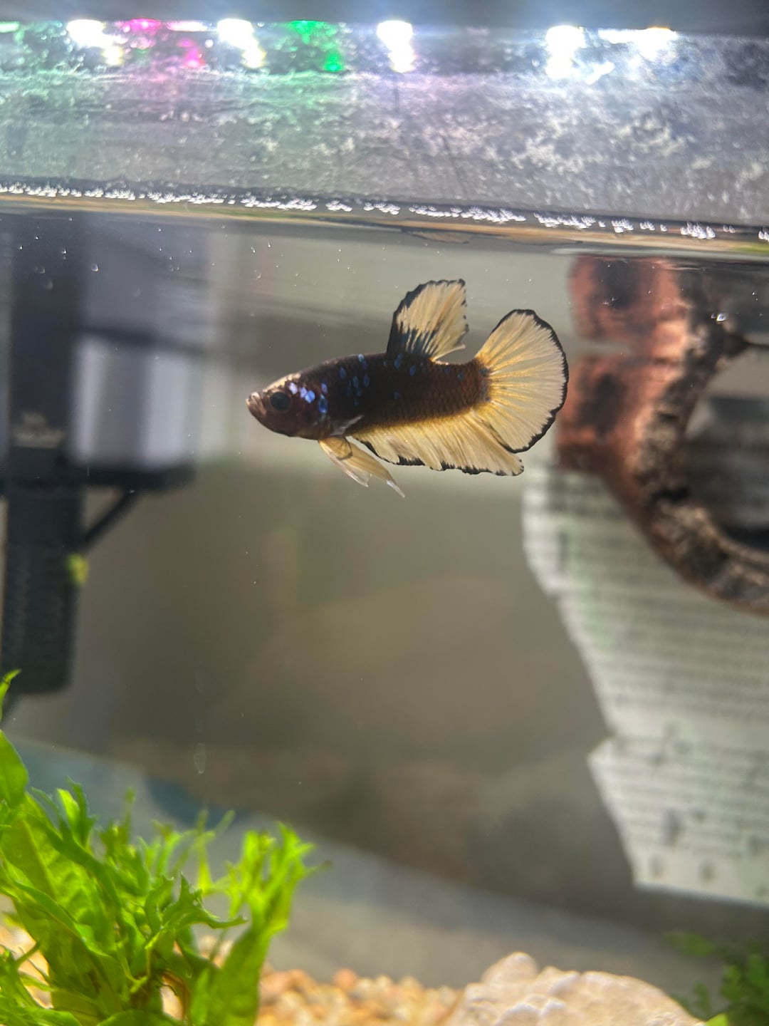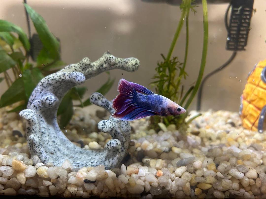 Hi guys, this is my first time posting on here. Here is my fish, mustard, and my husbands fish, Akaza. They’re each in their own 5 gallon tank with a heater and filter and some live plants.