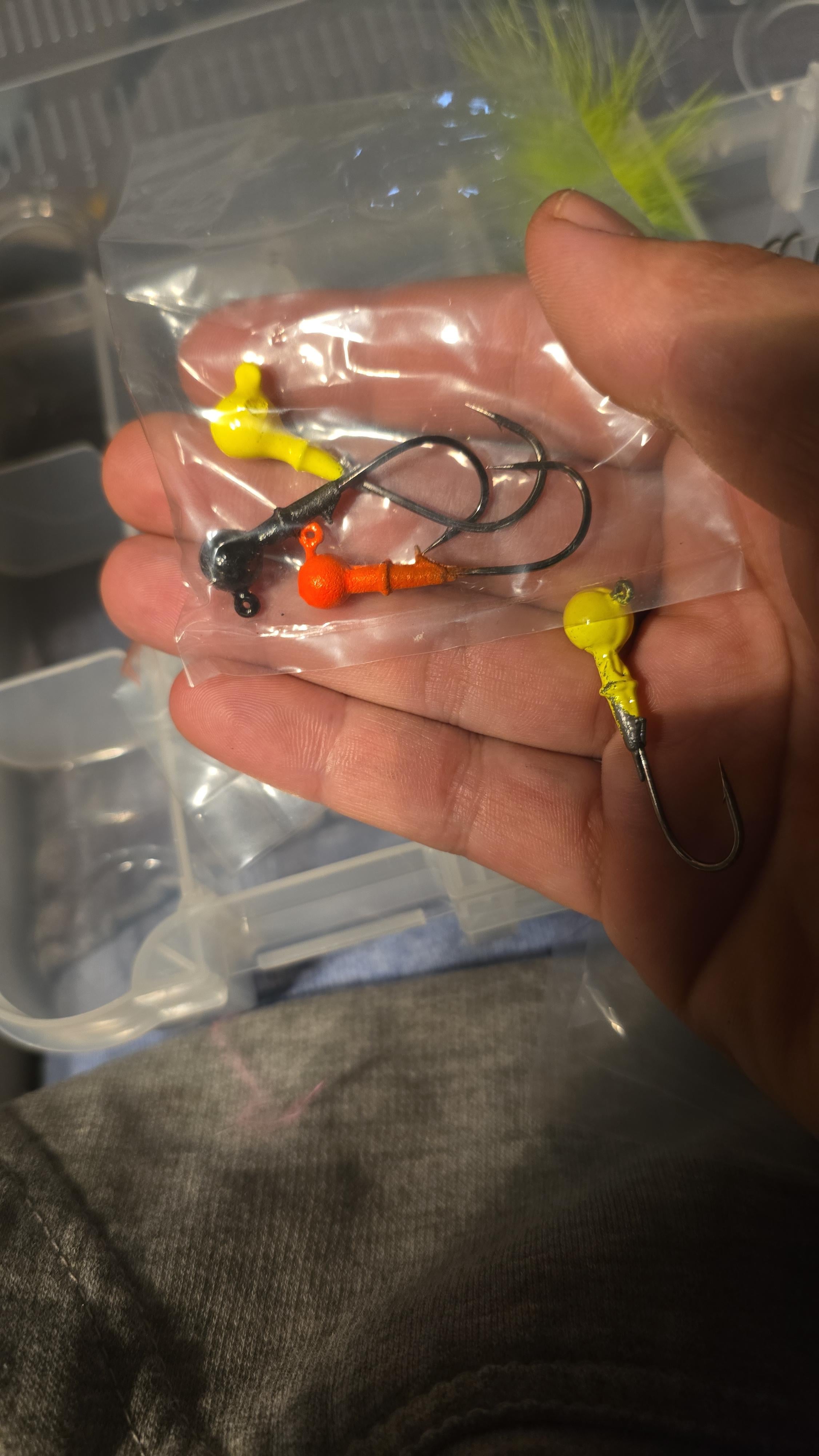 I use these on my garmin lvs 34….. I use them from a 1/8 to about 5/8 sometimes 3/4oz depending on how deep i wanna fish. Ik ill get a ton of crap for the paint and stuff but I love pouring these heads and catching fish on them and I just thought id share. I use zman big trd and some of the keitch swing impacts and some megassbass swimbaits. Its so rewarding catching fish on these. Especially a big pike. Hitting rock ledges .main lake points and some bumps and reefs in like 40 to 60 ft of water coming up to like 5-15ft. Is so fun to fish in with these.