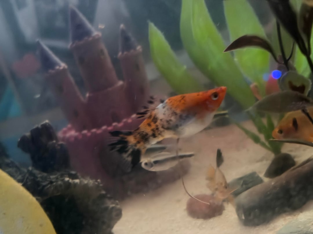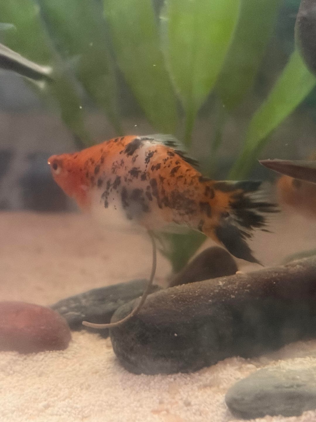 This is my swords tail, I think she is pregnant but I wanted a second opinion, I originally feared it was dropsy but she has no lifting of her scales or no other signs besides being fat. I researched pregnancy in swords tails and she does have the black spot in her belly and the box belly as well as she’s still eating and doing her normal. I have no swords tail males in my tank and got her from the pet store 1 month ago maybe a little longer ? I just want a second opinion before I go by a fry net and such
