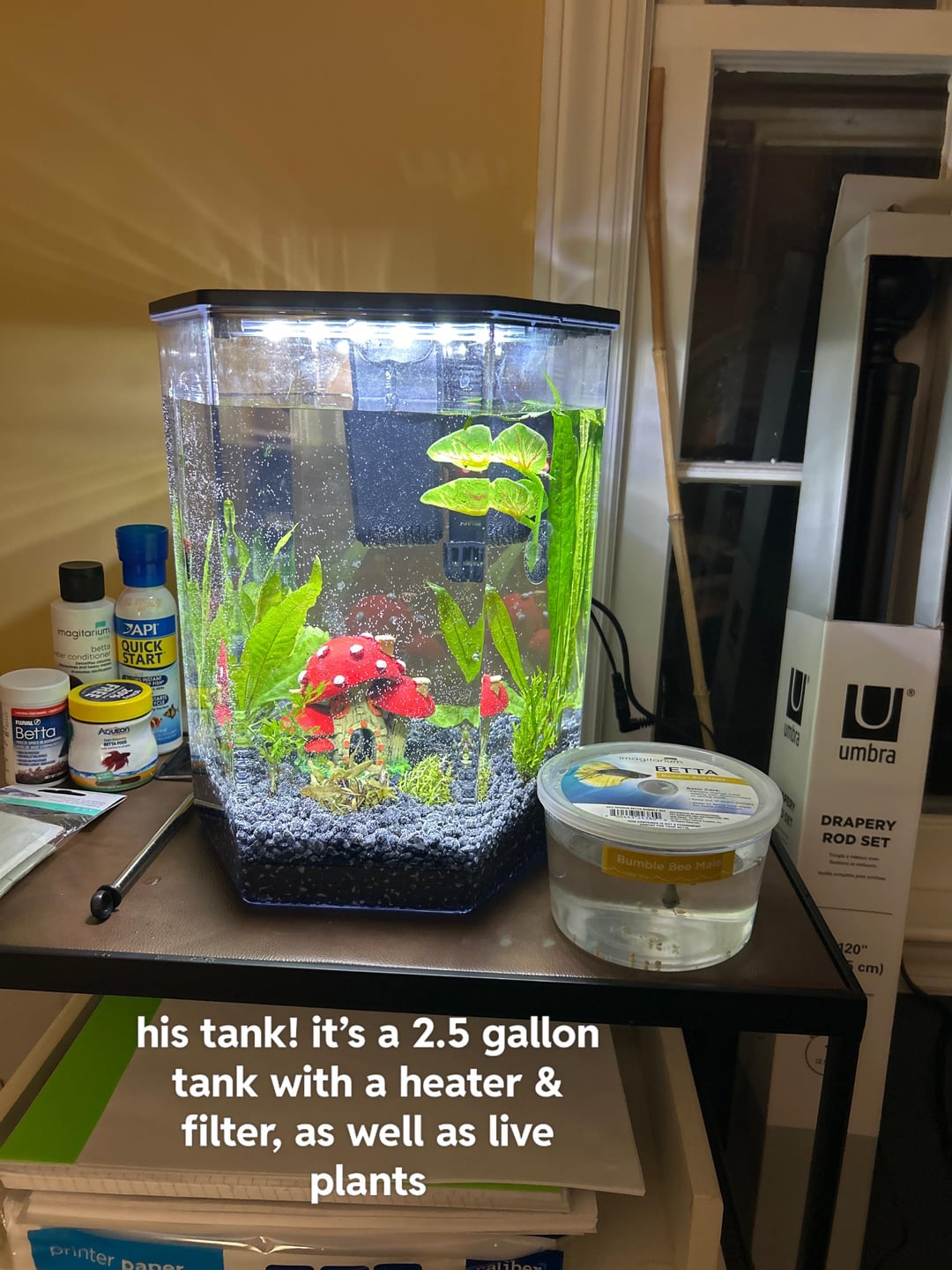 I wanted to show off my tank, but this is the first time (as an adult) that I have a betta fish! His name is Bumblebee and I got him from Petco. I named him Bumblebee because i’m a huuuuge transformers fan lol also because it said he was a bumble bee betta