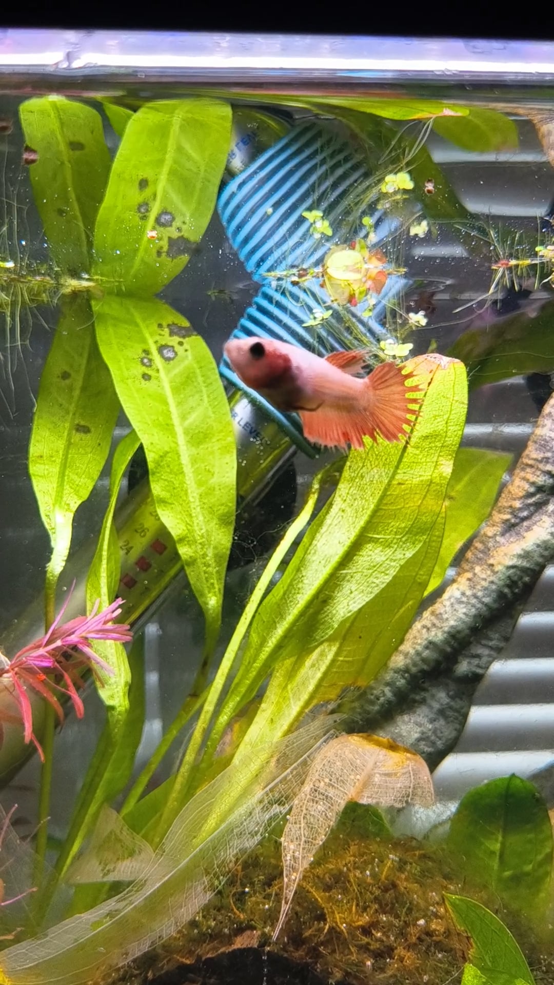 This is my new betta. Her name is Nana and I've had her for a week. Do you think her color will intensify as she gets older? I haven't really had bettas so light you can see through them a bit so I don't know what to expect from her as she develops :>