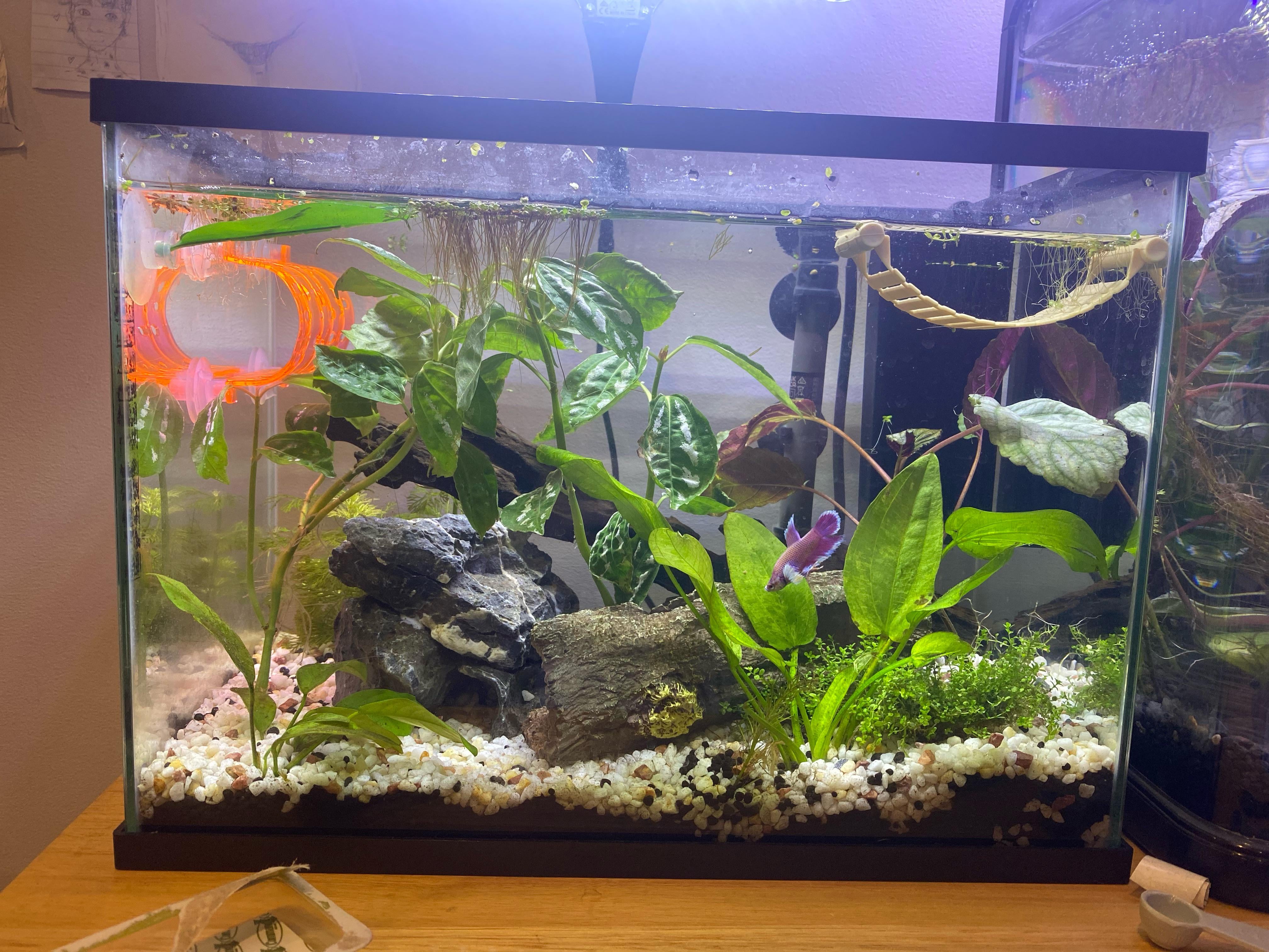 I've only just realised that ALL sides of my tank are mirrored 🙁 I thought he could see me because he would always come to the front of the tank when I poked my head around to take a look at him. This is only a 4.2 gal and Im thinking about moving him to my new 8.5 gal tank after it establishes. Would suddenly going from a reflective tank to a clear, acrylic tank stress him out?