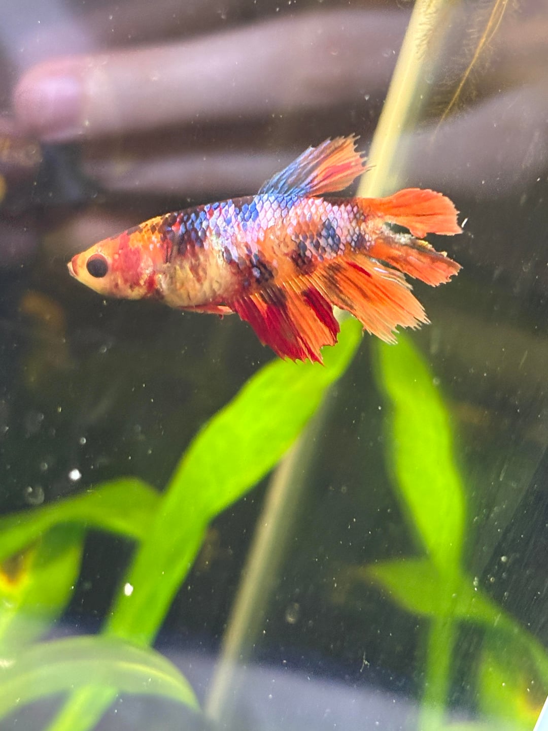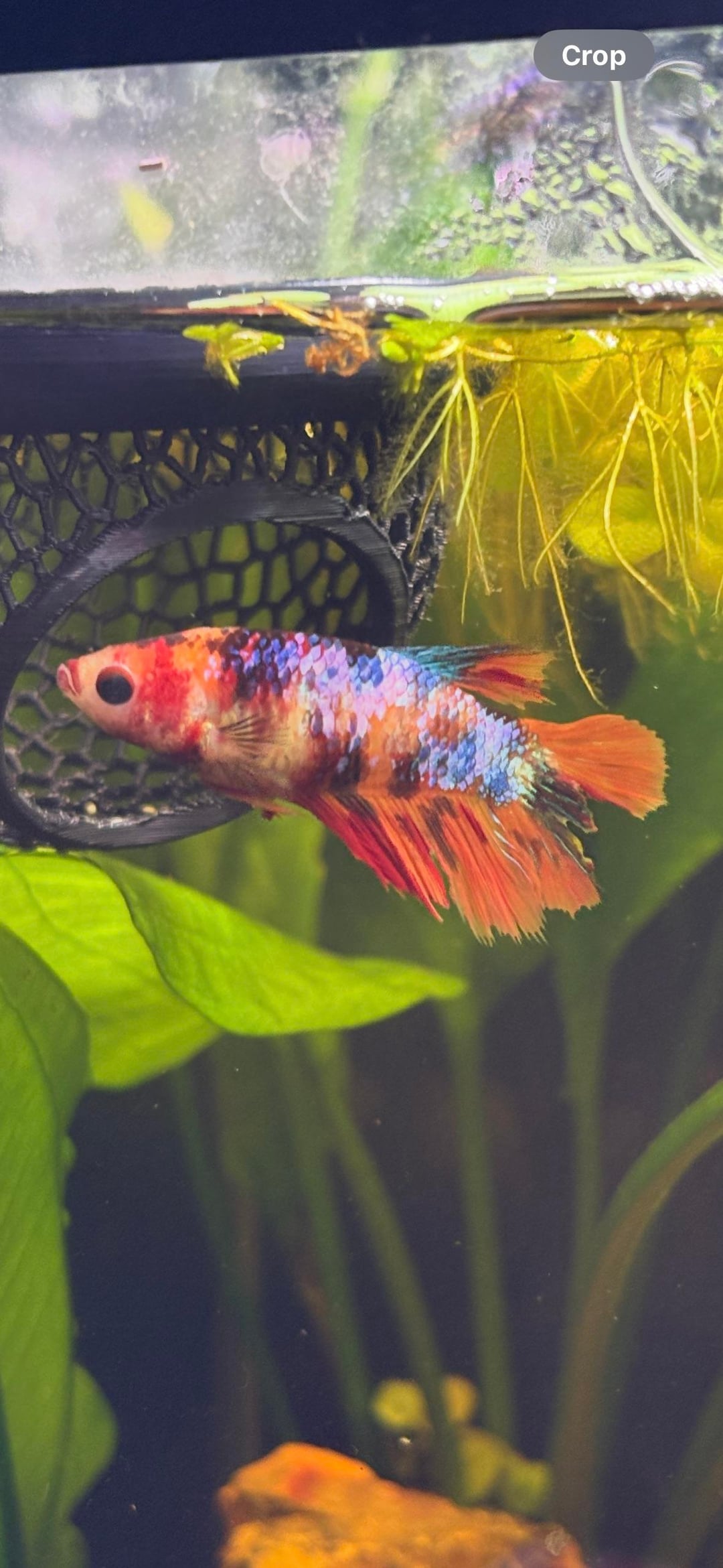 (first image is her happy and healthy) hi guys I really need some advice please. my sweet girl has always been such an active happy fish. but recently I’ve been really worried about her. I noticed a couple weeks ago some fin was torn (second photo). I wasn’t thinking it was fin nipping because she hasn’t ever shown signs of stress since i’ve had her. I always try to enrich her as well. well two days later after I noticed that I came home to find she had jumped from her tank. thank goodness she landed on a plastic bag and was kept moist. she recovered very quickly and was showing great signs of improvement! well 4 days after the jump I had to move her with me for winter break. we did this once before for thanksgiving and she didn’t even show stress signs in the new tank at my parents house she actually really thrived. so she was doing very well at the start of this break. well i started to treat her for parasites about a week and a half ago because I knew she had been showing signs for a while. now since starting the meds she only rests at the bottom of the tank and hides in a little cave. it breaks my heart that maybe i rushed into medication but i knew it had to be done. now she’s nipped off the new fin growth on the back fin and it’s very deep and i noticed this last night. what can i do you guys please help. I also want to say that my parameters are perfect so it can’t be that, and my filter is very low flow, the temperature is always around 78-79 degrees and all decor is safe for her, i also have the tank HEAVILY planted.