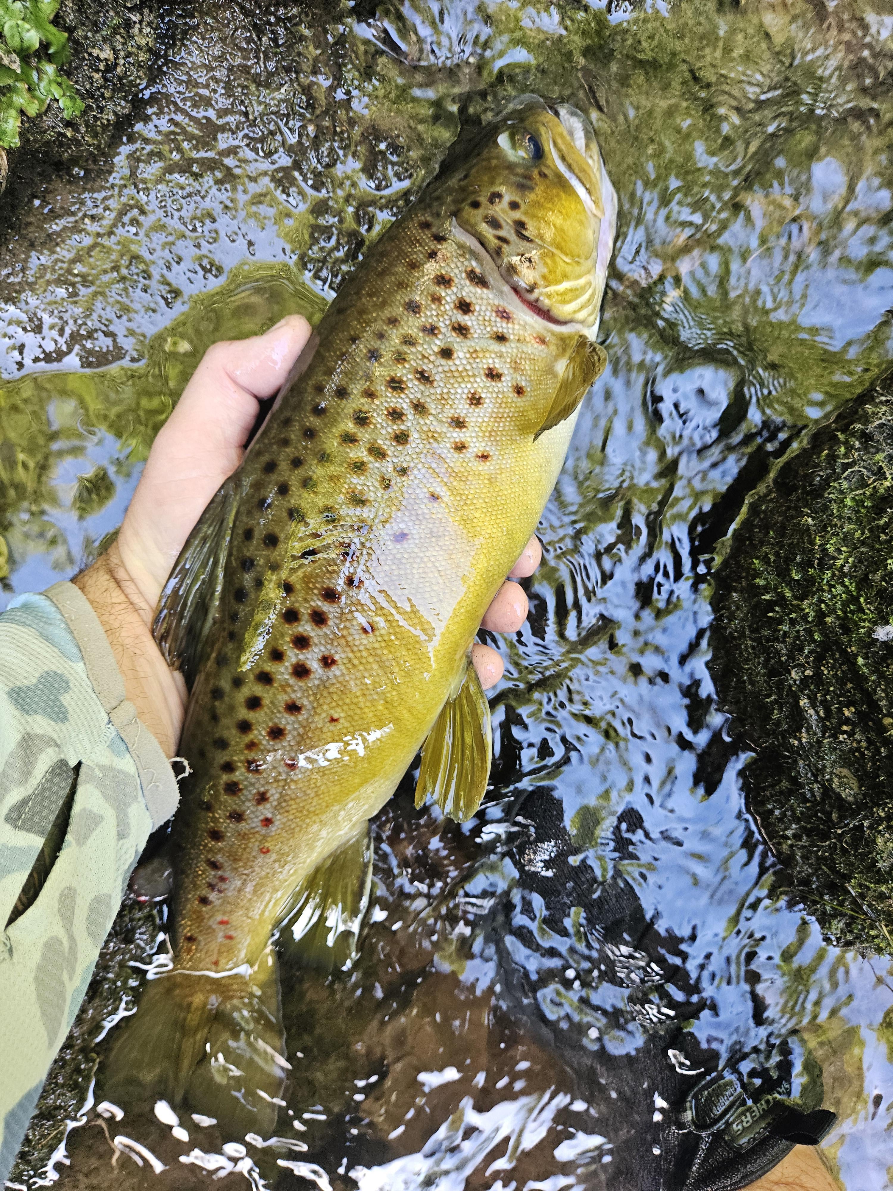 I used to fish a stream here in northern Colorado that had tons of nice little 10 inchers , but there was a stretch of deeper water with a big brown like this…I caught him several times over a few years before the creek was wiped out by 2 floods and forest fires…always made me smile to catch him!