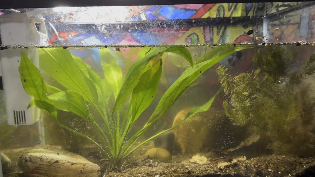 I have been watching a bunch of videos and reading and doing a bunch of research and decided to upgrade her tank since she seemed sad, I got her into a 10gallon instead of a 5 gallon, got all live plants and sand and dirt (it stirred up a little when I put her and the guppies in) and everything. This is about 2 minutes after I put her into it, it’s not done yet but it’s looking a lot better! More plants in the mail!!!