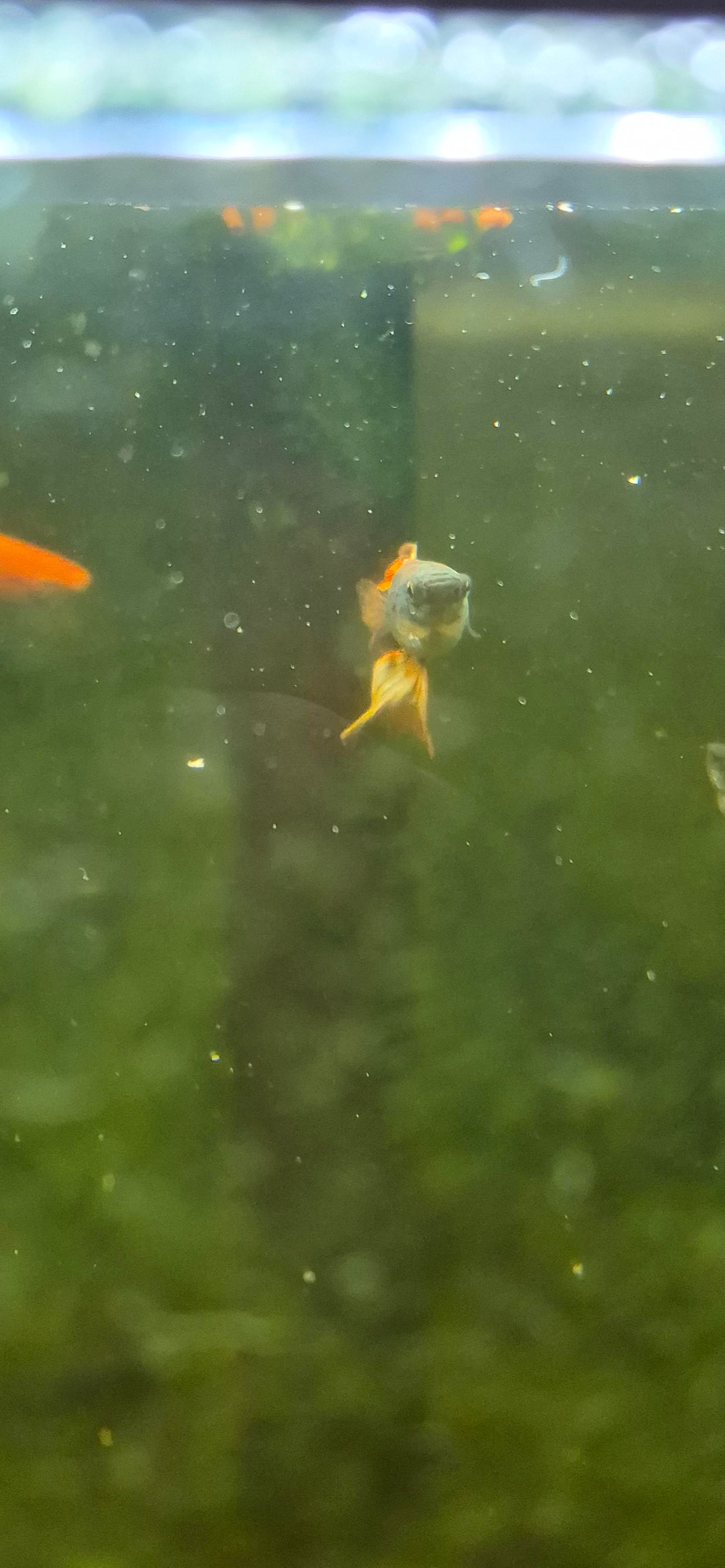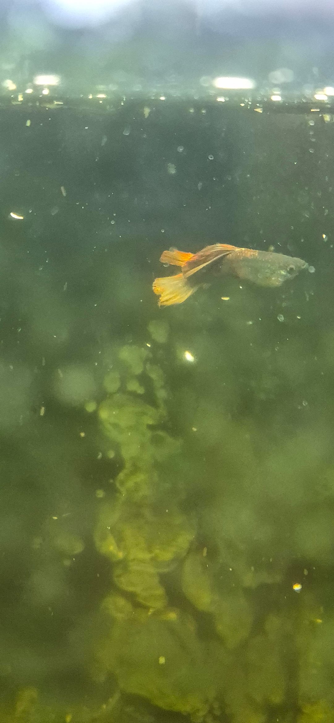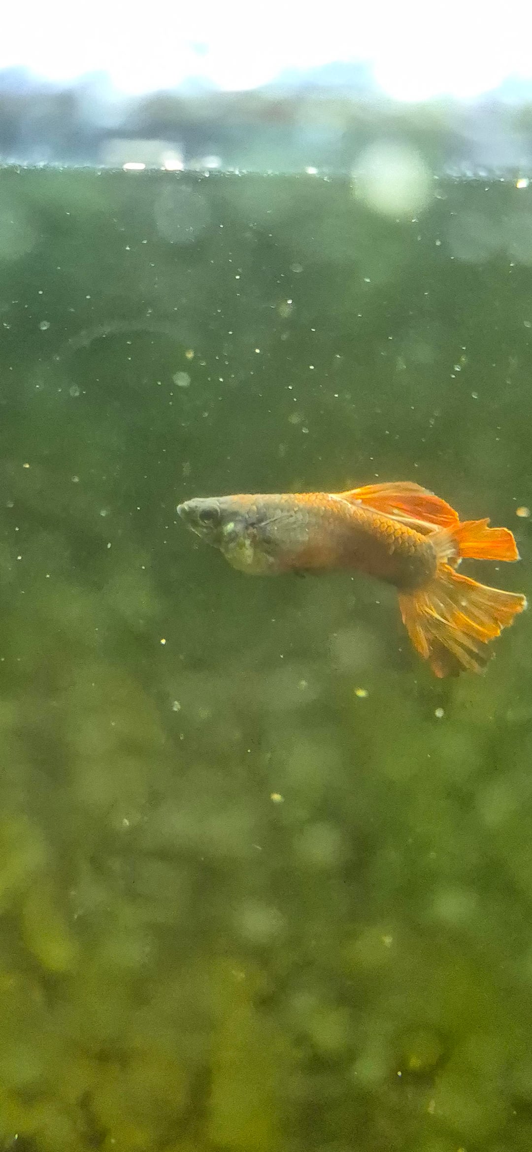 This is my parents tank and one of their guppies has a huge stomach. They are wondering if they were accidentally sold a female because they bought males from the male Guppy tank at the pet store. Does this look like a pregnant female or a bloated male? If its a bloated male, what can they do to help? Sorry for the poor picture quality the guppies move fast and my parents are due to clean the algae in the tank!