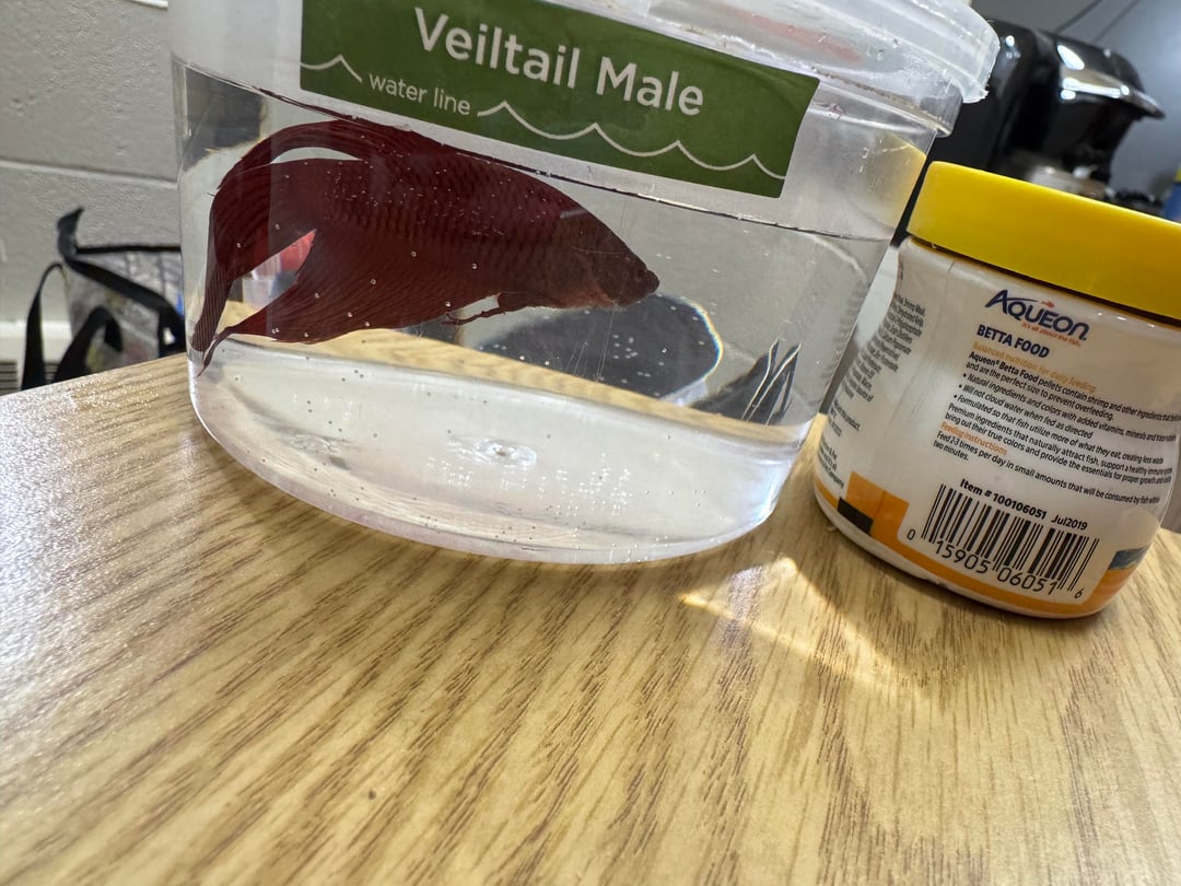 That fish needs a real tank and no less than 5 gallons, filtered, water cycled. Your teacher is not a responsible owner.