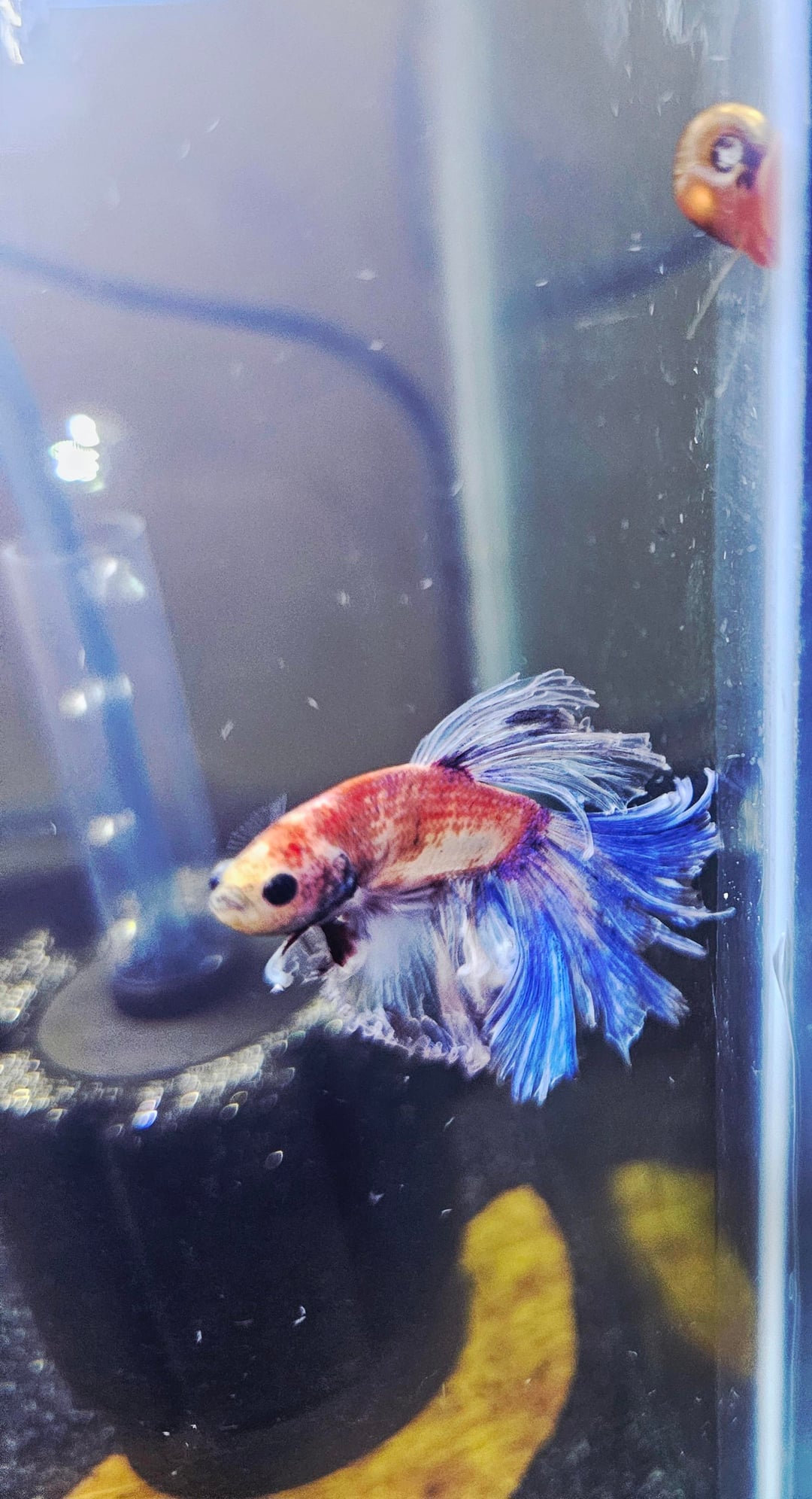 But this betta caught my eyes, he moves to every inch of soil, to every inch of the tank, sees them, etc. He even followed my finger in the store. Even brought his tankmate- Ramshorn Snail which the shop owner gave for free. He didn't even poke ramshorn's antennas.