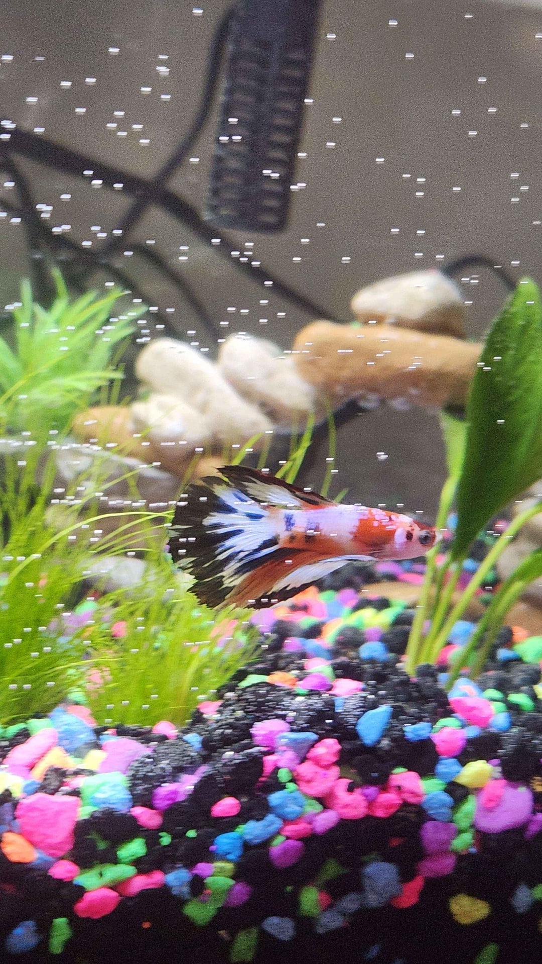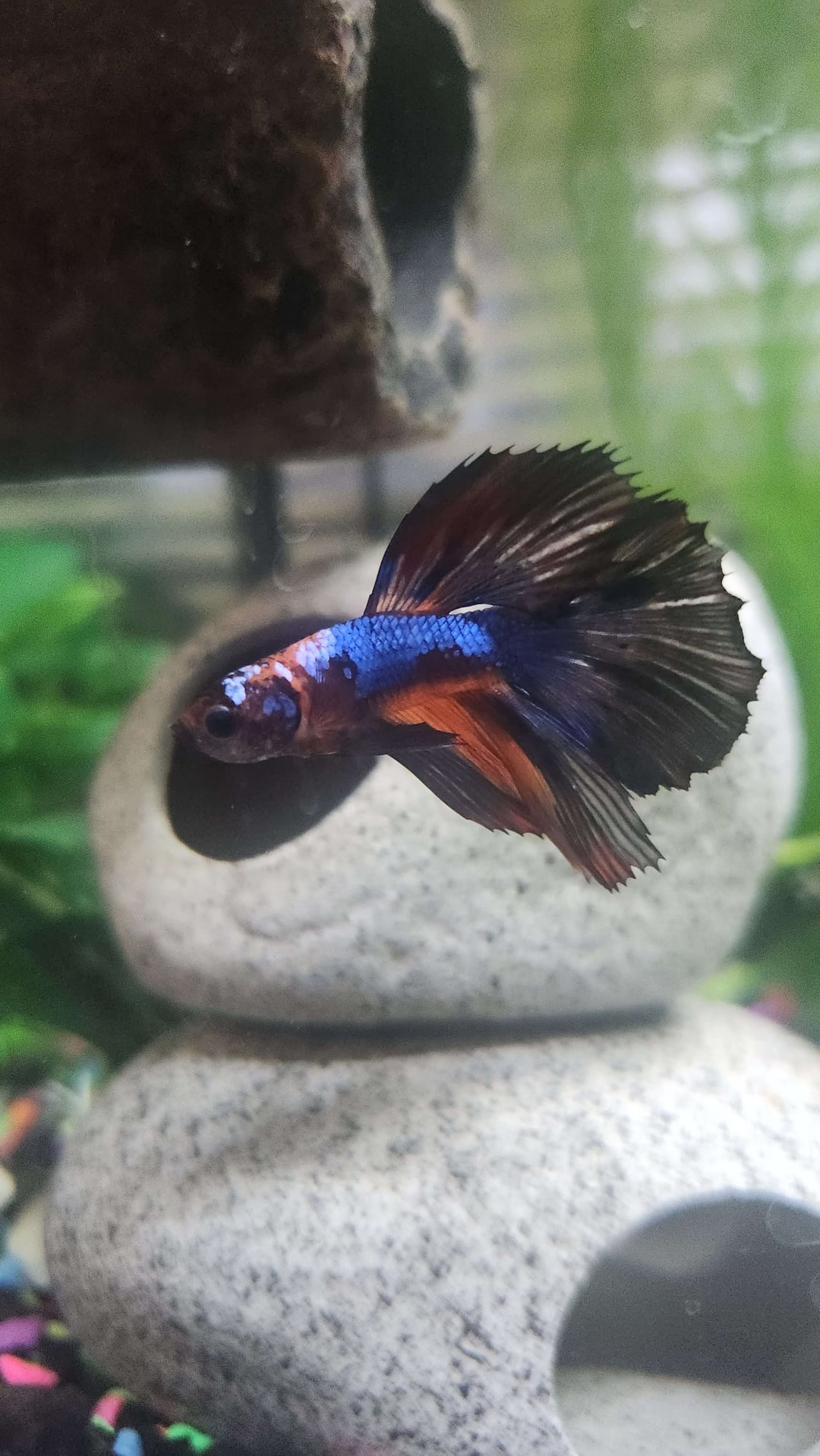 Loving his color changes. He's pretty picky with water parameters and has gotten bladder issues twice now but we work through it pretty quickly all things considered. I'm a disabled college student so I ended up replacing his live plants for silk ones for the time being with a hope to retry live plants in late January. A few weeks ago I introduced a small school of ember tetras in hopes to keep them temporarily in here while I get a second tank approved by my college for my dorm (which got delayed) and they've been doing great with London! No hostility from either side or nipping at all during this temporary situation and it's actually has got London more active. ​