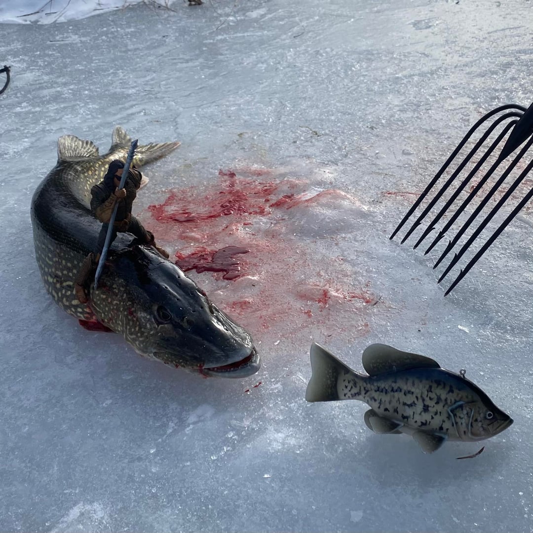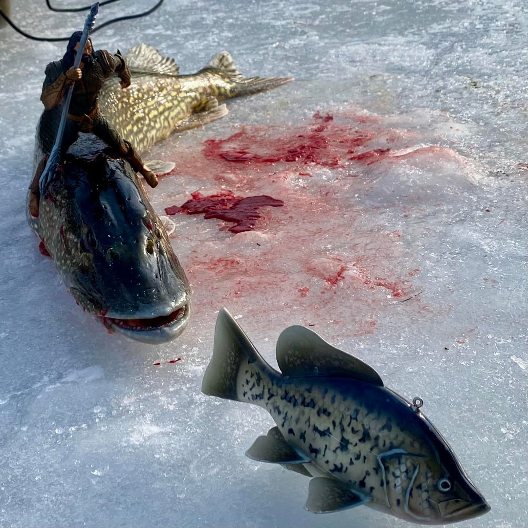Crappie decoy brought in a 37” female yesterday morning. When I pulled it up I saw it was about to thrash off the spear so I jammed her head up against the side of the hole so I wouldn’t lose her as I unzipped the shelter door. Got the door open, and she wouldn’t let go of the foam floor mat I use on the bottom of my fabric shelter. Had to use the ice scoop to pry her mouth open and wrestle her out the door and on the ice.