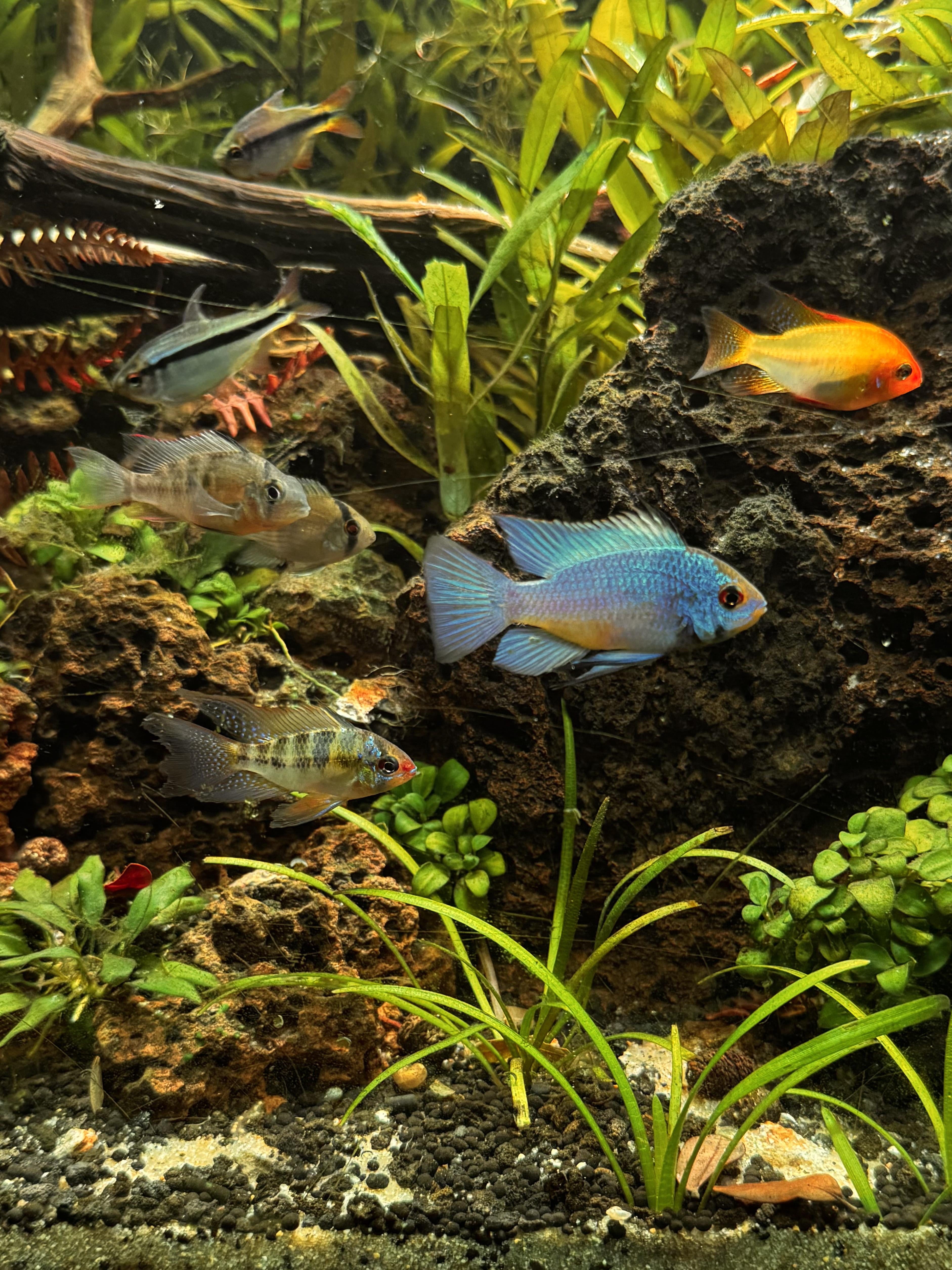Featuring: Electric Blue Ram Gold Ram Longfin German Ram Bolivian Ram Special appearances by one of my young Keyhole Cichlids and a few of my Imperial Lapis Tetras Posted by aConfusedOrphan