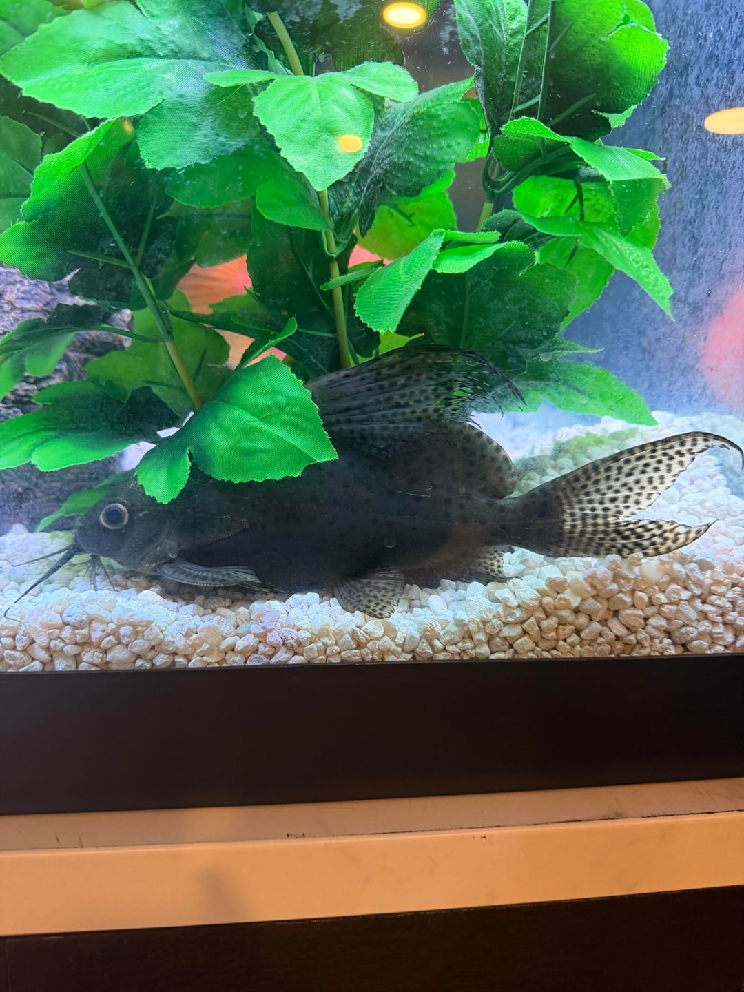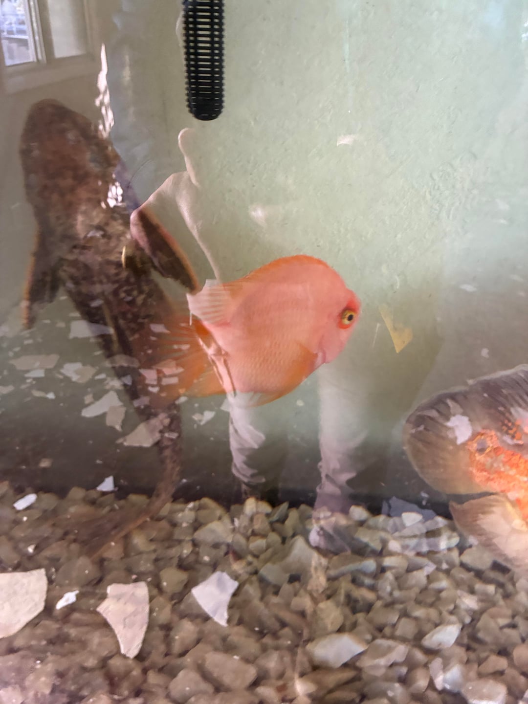 Anyway, now I have 1 lonely Blood Parrot fish in an empty tank and neither were doing too hot. I finally added some substrate and fake plants, and ended up getting a Synodontis so my BP wasn’t so lonely. They don’t really care for each other, but oh well?