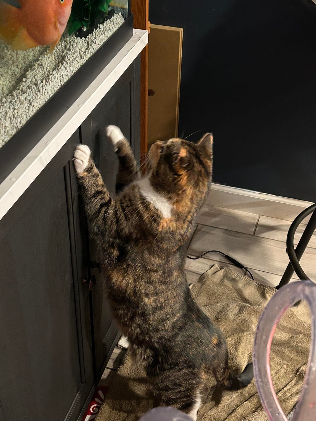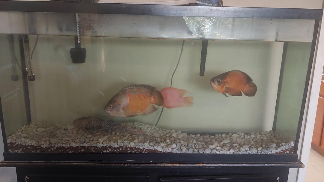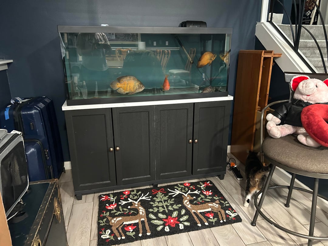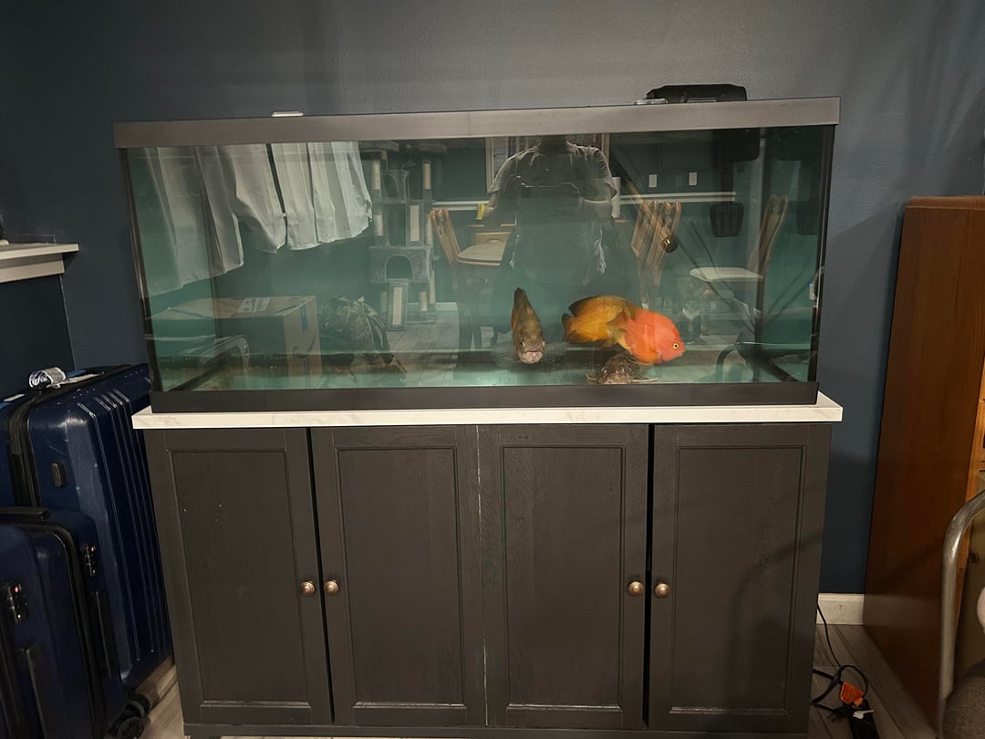 I got wind of 4 large fish in a 65 gallon tank that were abandoned in a house. Property manager wanted to just “get rid of them,” but a maintenance worker was trying to find a home for them. Spouse said it would probably be a bad idea, but I reached out to the maintenance guy anyway and arranged a time to pick up the fish, tank, and stand the next day. The fish were 2 Oscars, a large Pleco, and a large blood parrot fish. 1 Oscar was 9ish inches, the other about 8, and the pleco was like 12. The BP is like 5-6?