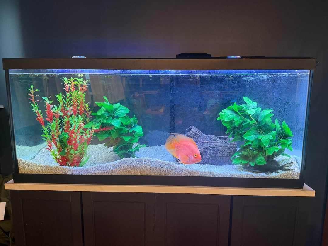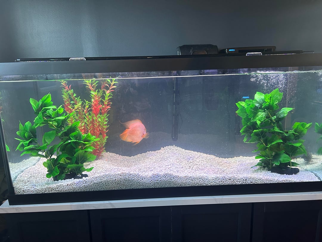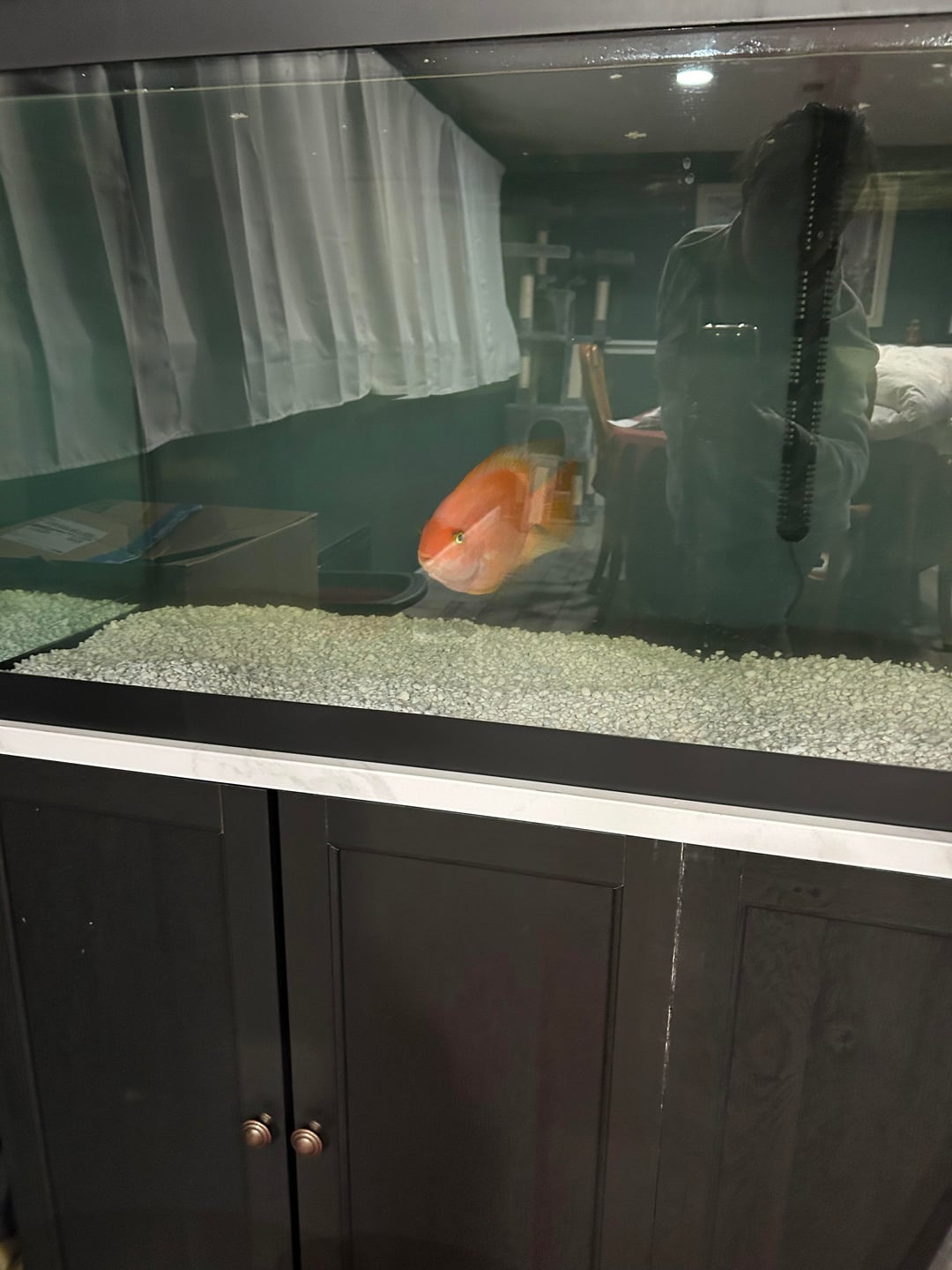 Over the next couple of weeks, I was struggling to keep up with maintenance of the tank. We went out of town for a couple days, and our pet sitter way overfed them and the tank looked HORRIBLE when I got back. I reached out to the LFS and we decided to donate the 2 Oscars and pleco and for us to keep the Blood Parrot. I was sad to see them go, but LFS assured me they have good clients and they would go to good homes.