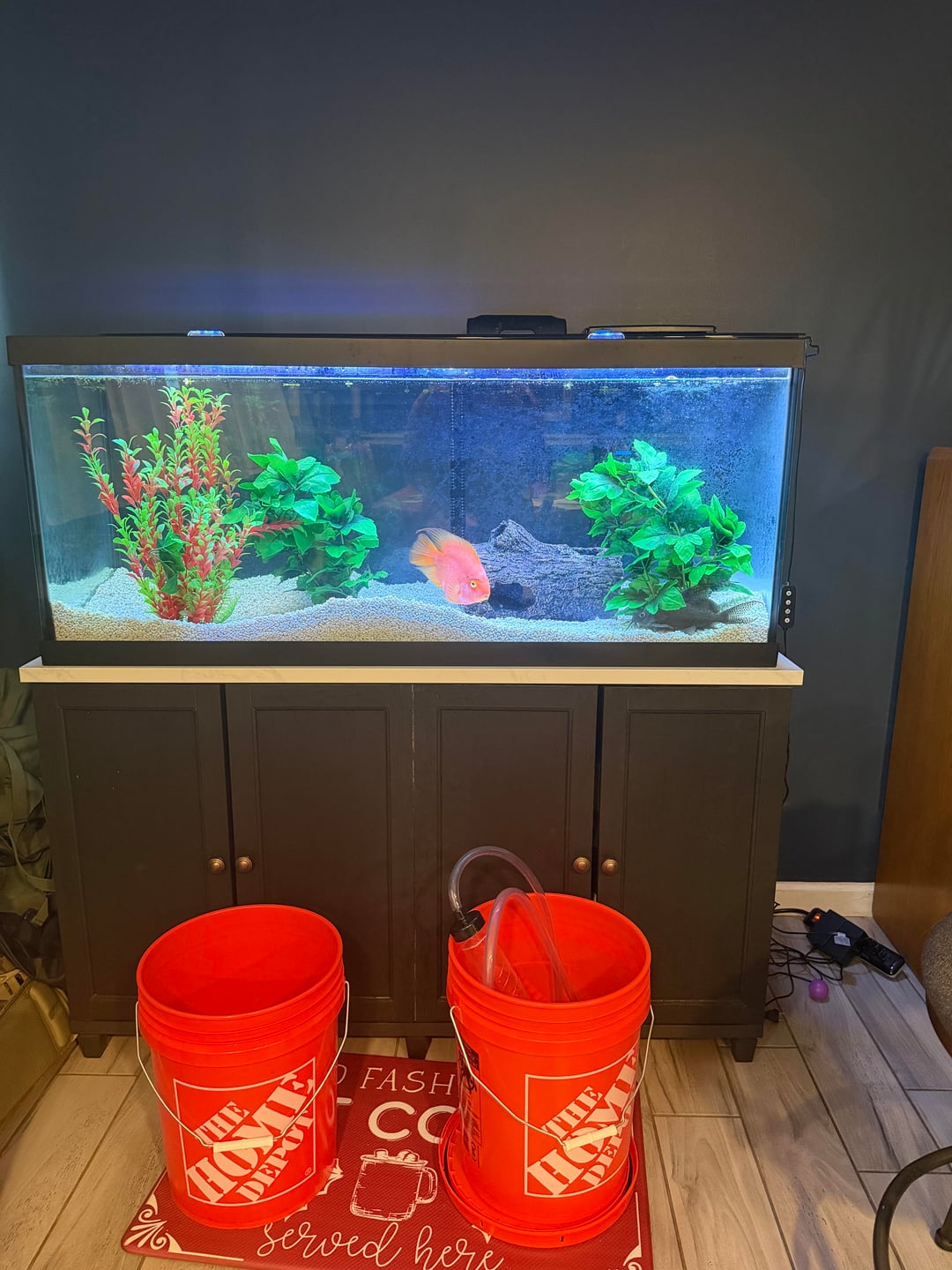 Tank still wasn’t doing well bc I wasn’t doing big enough water changes and not enough, and the tank wasn’t fully cycled (LFS had to educate me). I added some carbon to the filter and have been alternating between 15 gallon and 25 gallon water changes every other week. I’ve also been getting a little stronger carrying these heavy water buckets, which I’m not mad at! It’s a nice mindless activity to change the water.