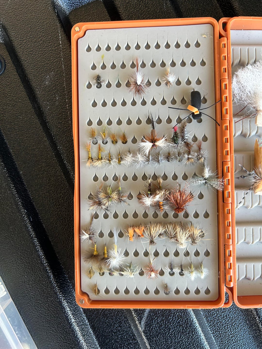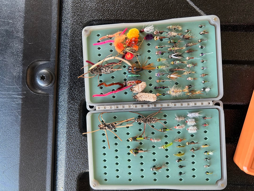 First pic is a bunch of elk haired caddies, parachutes and other dry flies, 2nd pic is a bunch of nymphs, some egg patterns worms and terrestrials. Decent flies overall.