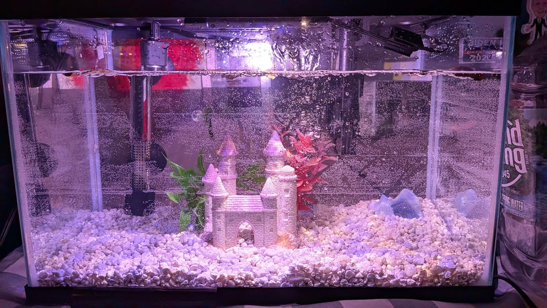 It’s nice for a snail… not for a betta fish though. They get exhausted swimming because they evolved to swim in shallow water and there are literally no places the fish can rest in this. They like to rest near the surface and on plants, I don’t see any here. Fake decor can leech plastic into your water and can tear the fins. They love hiding spots and exploring. It’s also way too bright and bettas don’t like light.