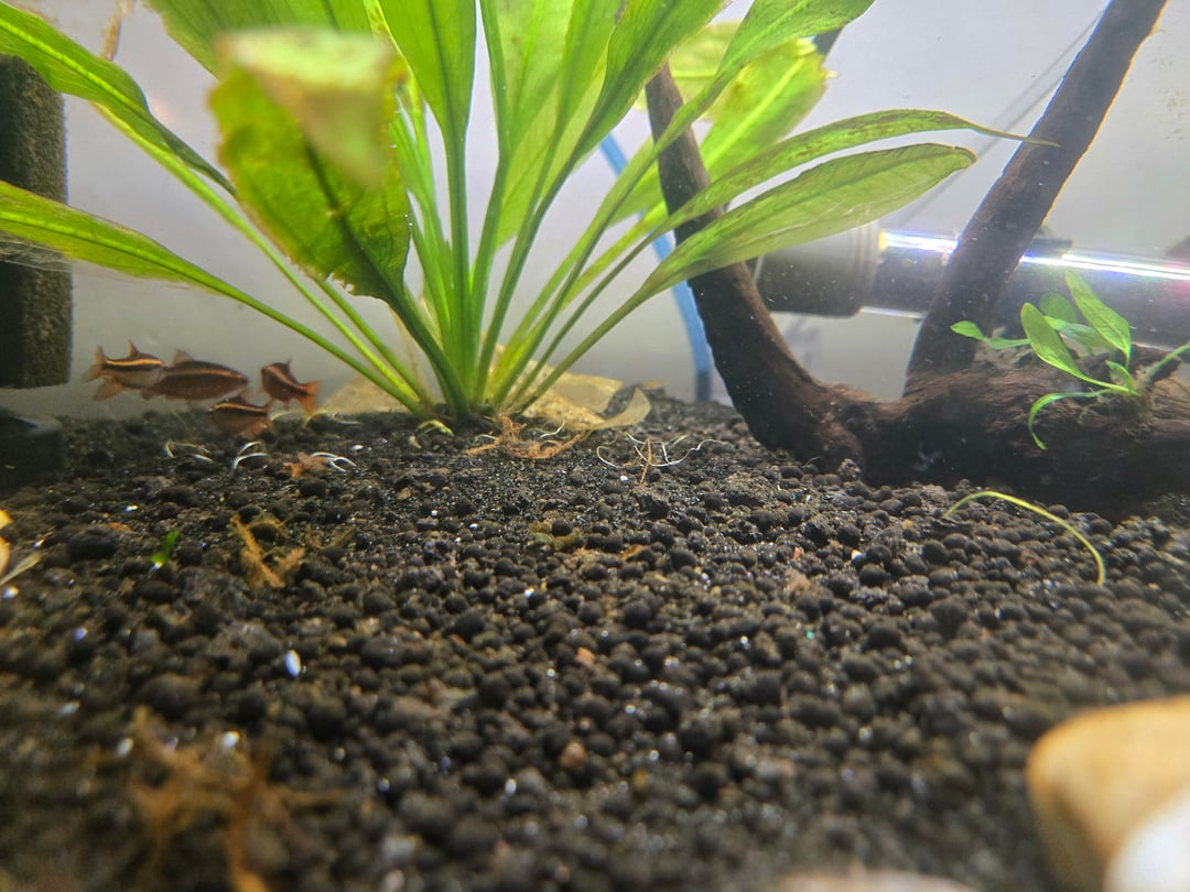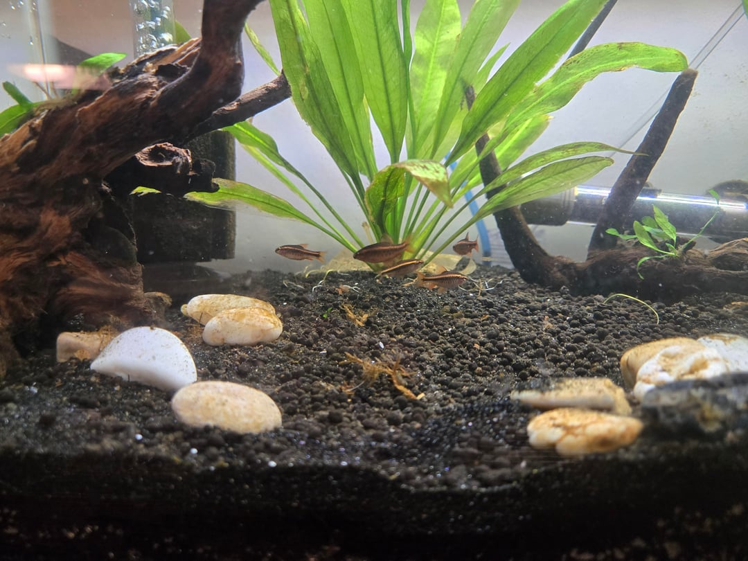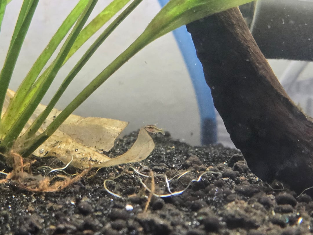Now, I have a 5g tank with her betta (unfortunately the gifted betta passed about a month ago, and a 20g with 7 cherry barbs and 2 nerite snails. I guess I'm doing something right, since last night I only had 6! I woke up and saw this little guy swimming around.