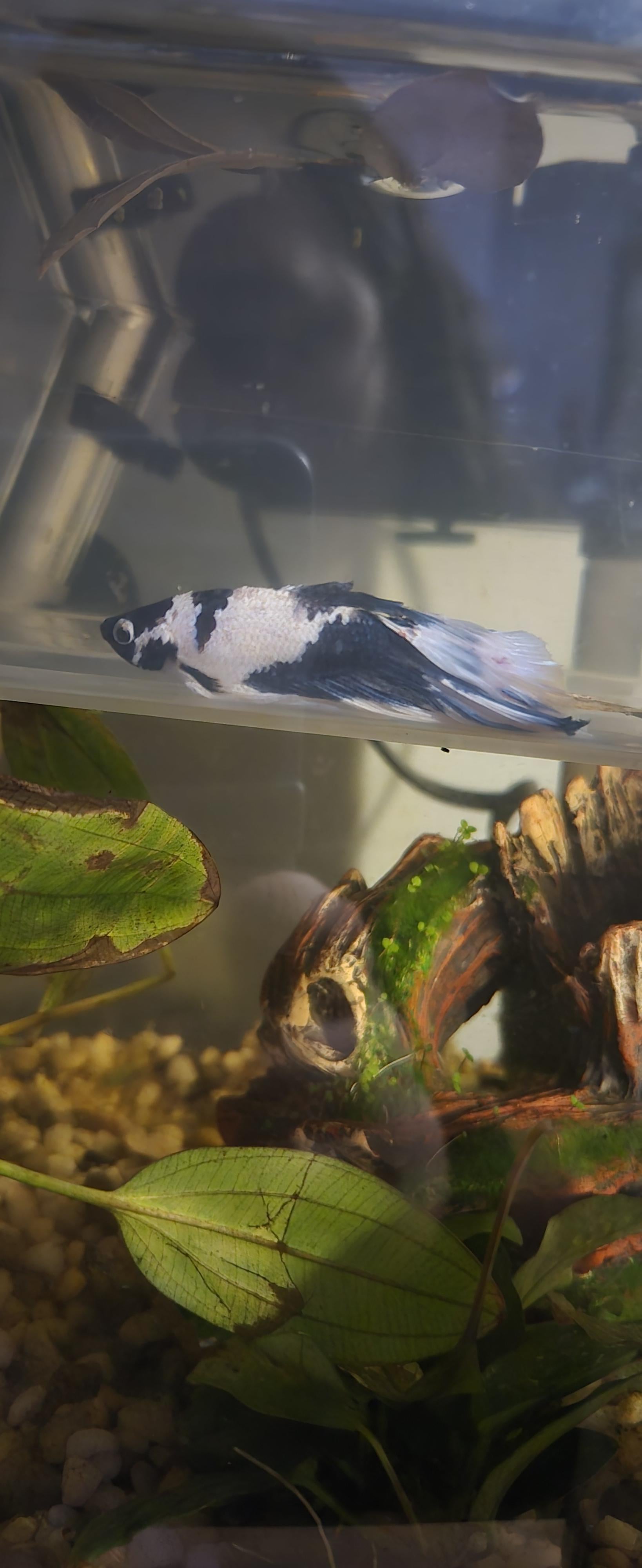 i came home today & noticed my man here was sitting at the bottom & had what looked like torn fins. he doesnt have tank mates. i think he might have managed to get stuck under some driftwood & struggled to get back out. i took tubberware & filled it with tank water to float & got him in it. it's christmas so i can't get a smaller tank to be a hospital tank right now with its own heater 😭