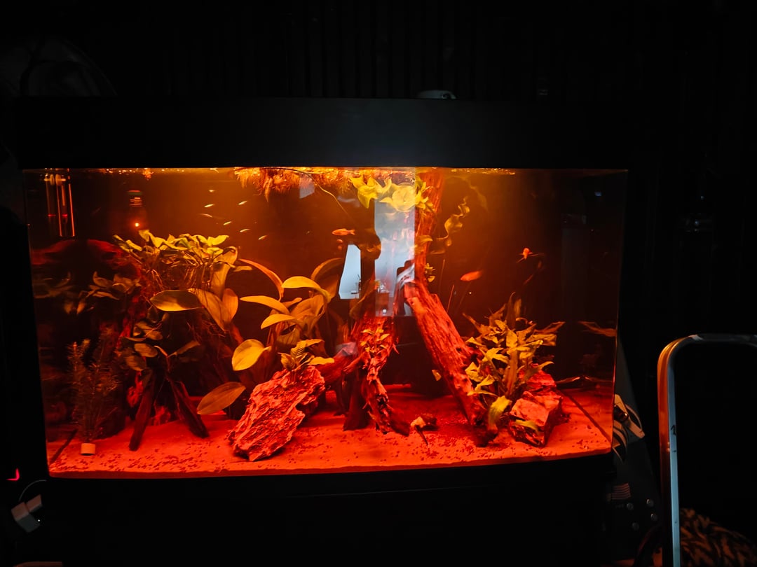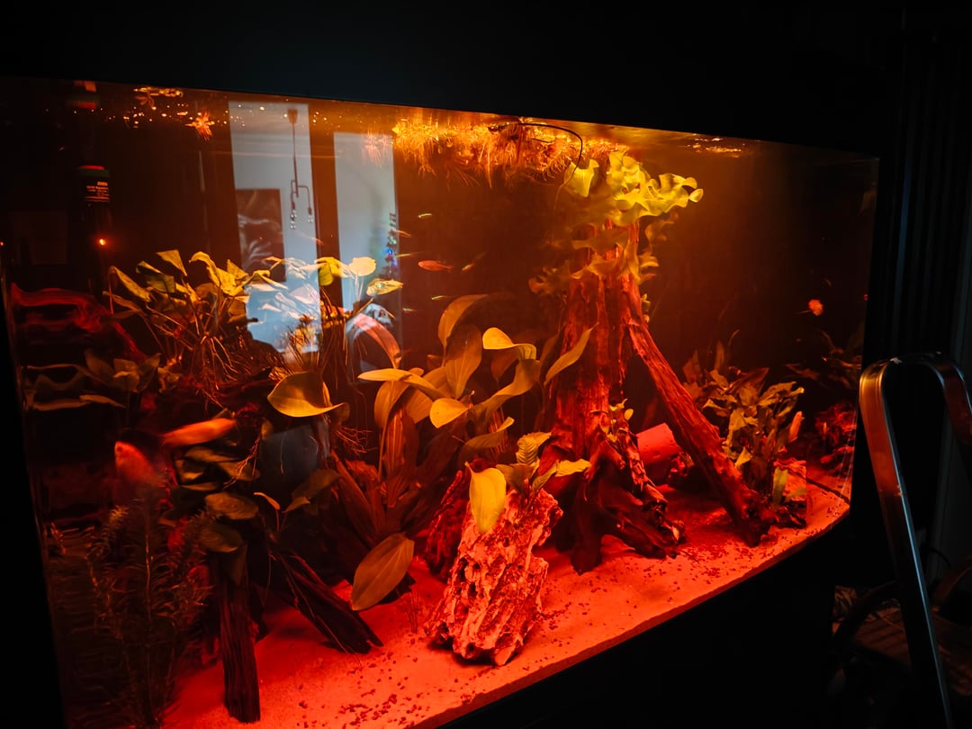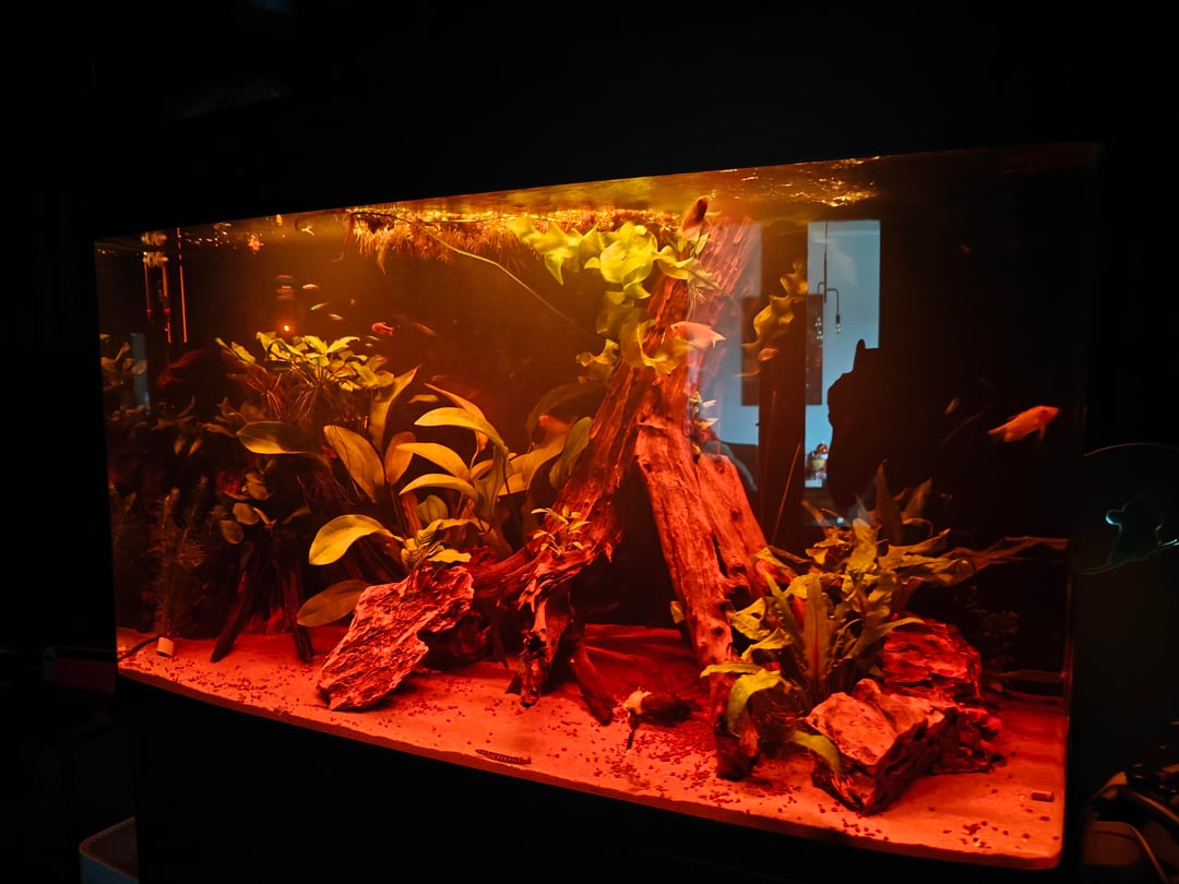 (sunrise in aquarium and dark room makes the aquarium look very red and bright)