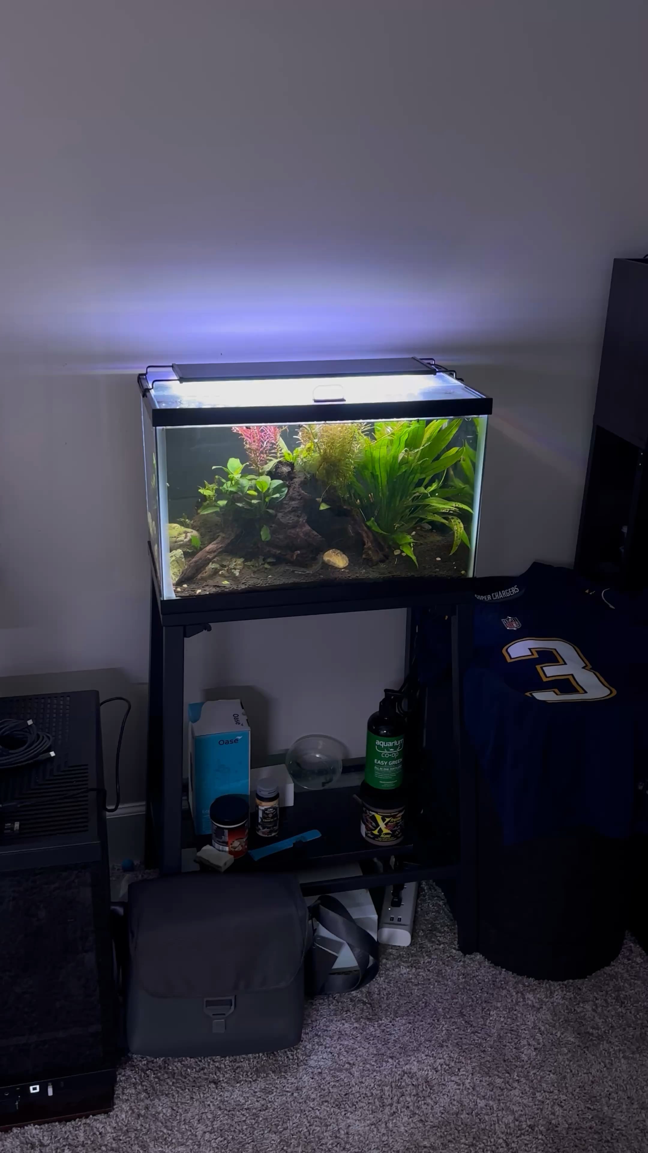 went from a Aqueon 10g tank and stand, to a UNS 60U rimless tank and stand (abt 20 gallons), what do we think about doing a dark water tank with daisy blue ricefish, panda cories, a (gentle) betta, and a clown pleco? (it will be seeded from a well stocked 78 gallon tank and overfiltered with an oase filtosmart 200 (meant for 55gal)