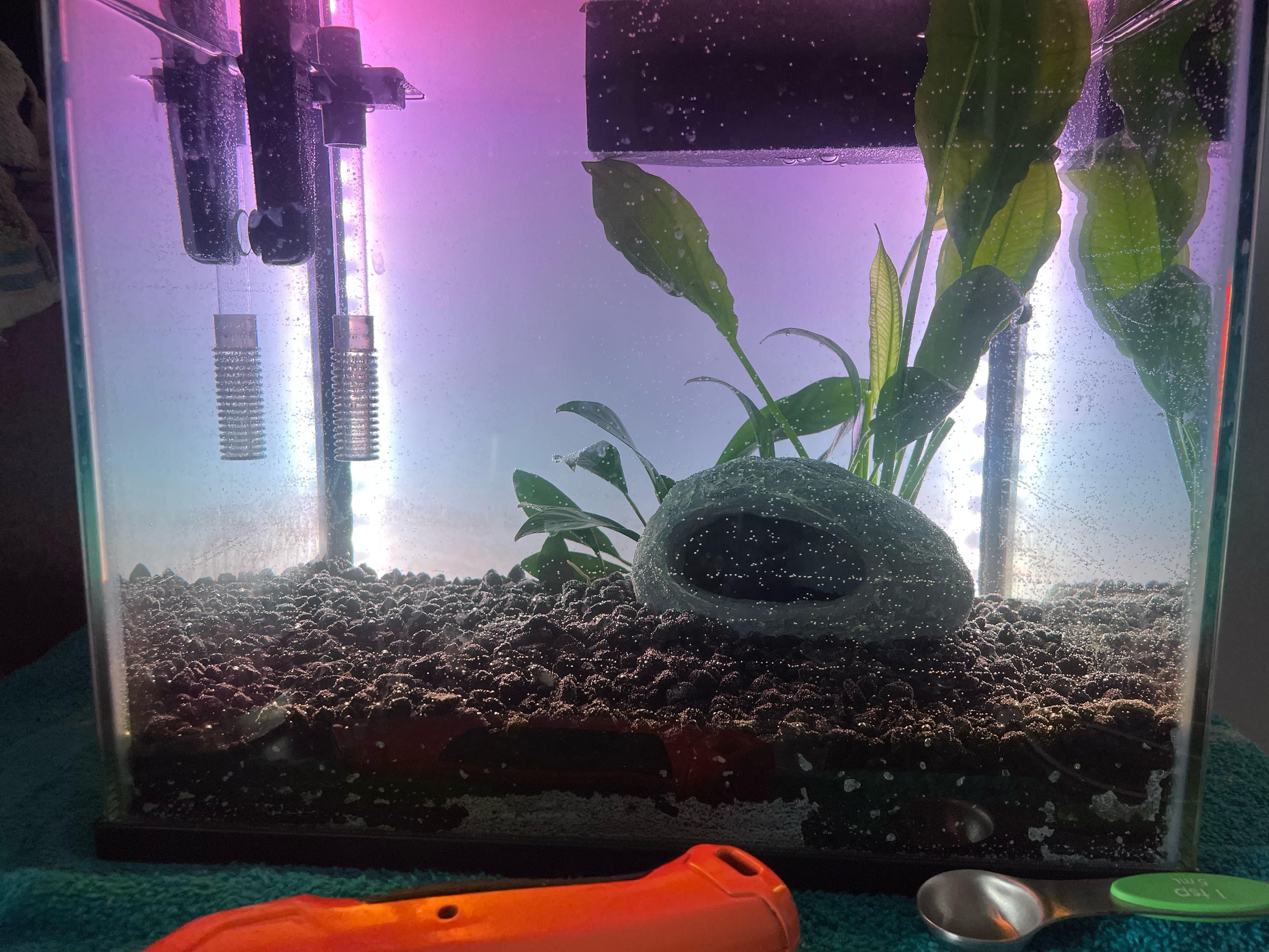 Unfortunately no stores near me had FritzZyme, Prime, or Ammo-lock so I will have to acquire those from online sources as well as a proper fish net, Siphon, and a few other objects to help with the manual cycle process for the upcoming month and a half ahead. They should arrive within the next two days. I am prioritizing the essentials but I do have plans to get better hide-holes, plants, as well as driftwood/leaves to get some tannins going once I am certain he looks like he is making it but I will have to hold off on the time being to get this guy settled in/healthier and my bank account to recover some more before I dump $200+ on stuff that might be useless should he unfortunately pass during this experimental/introduction period.