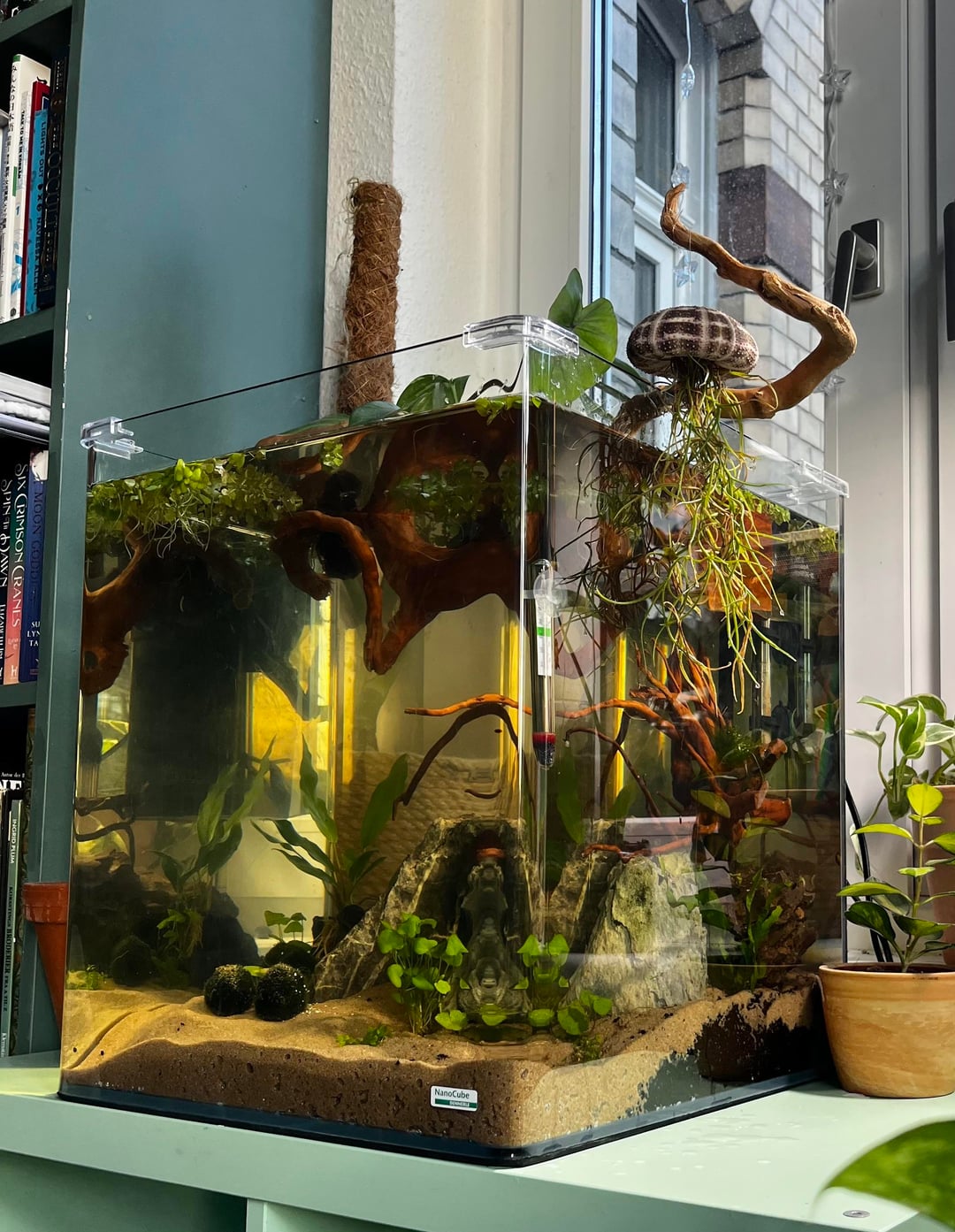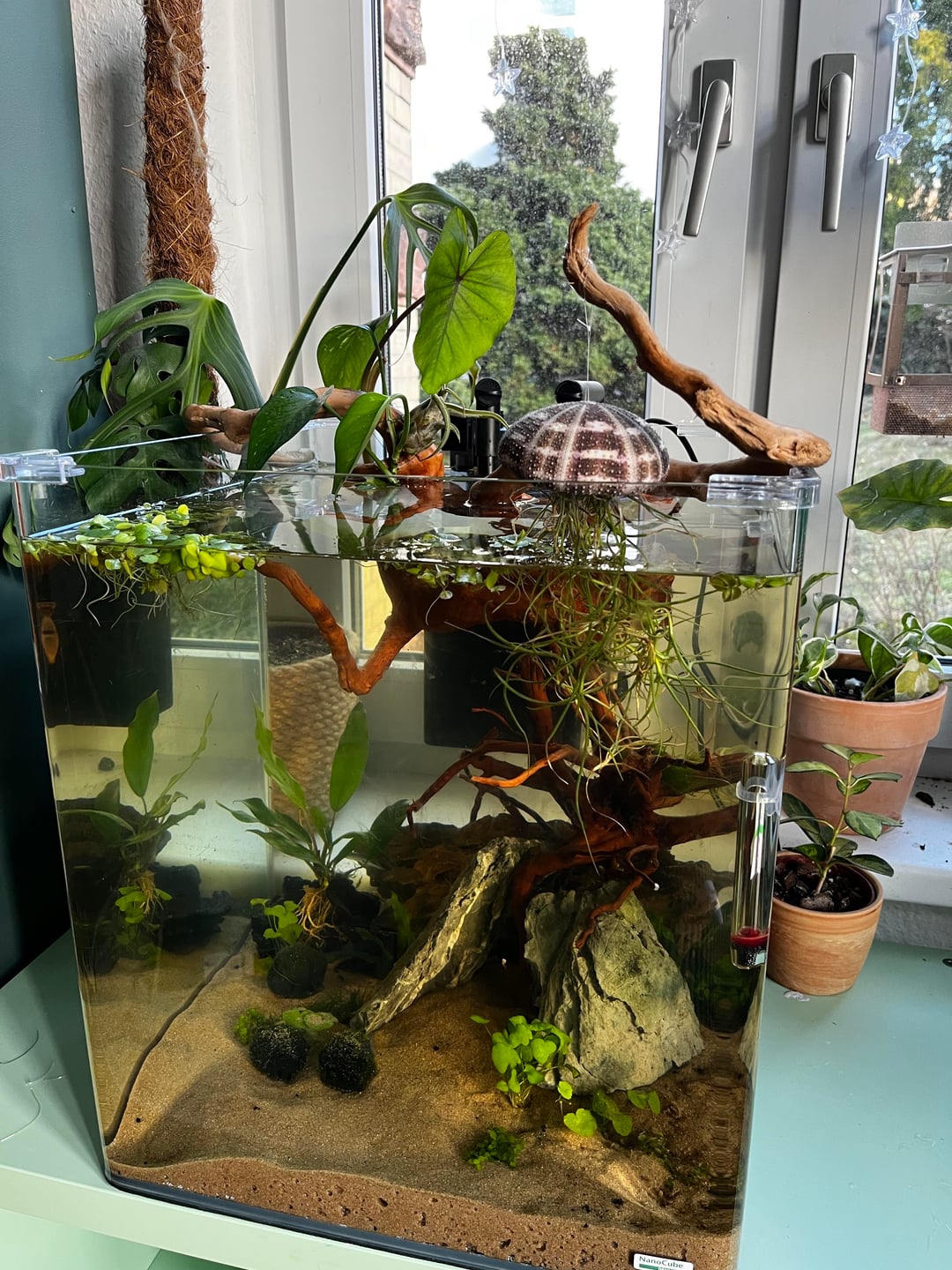 it’s now fully filled with water, added frogbit and a new root and topper plants 🙂 the air plant can conveniently be submerged whenever it’s watering time