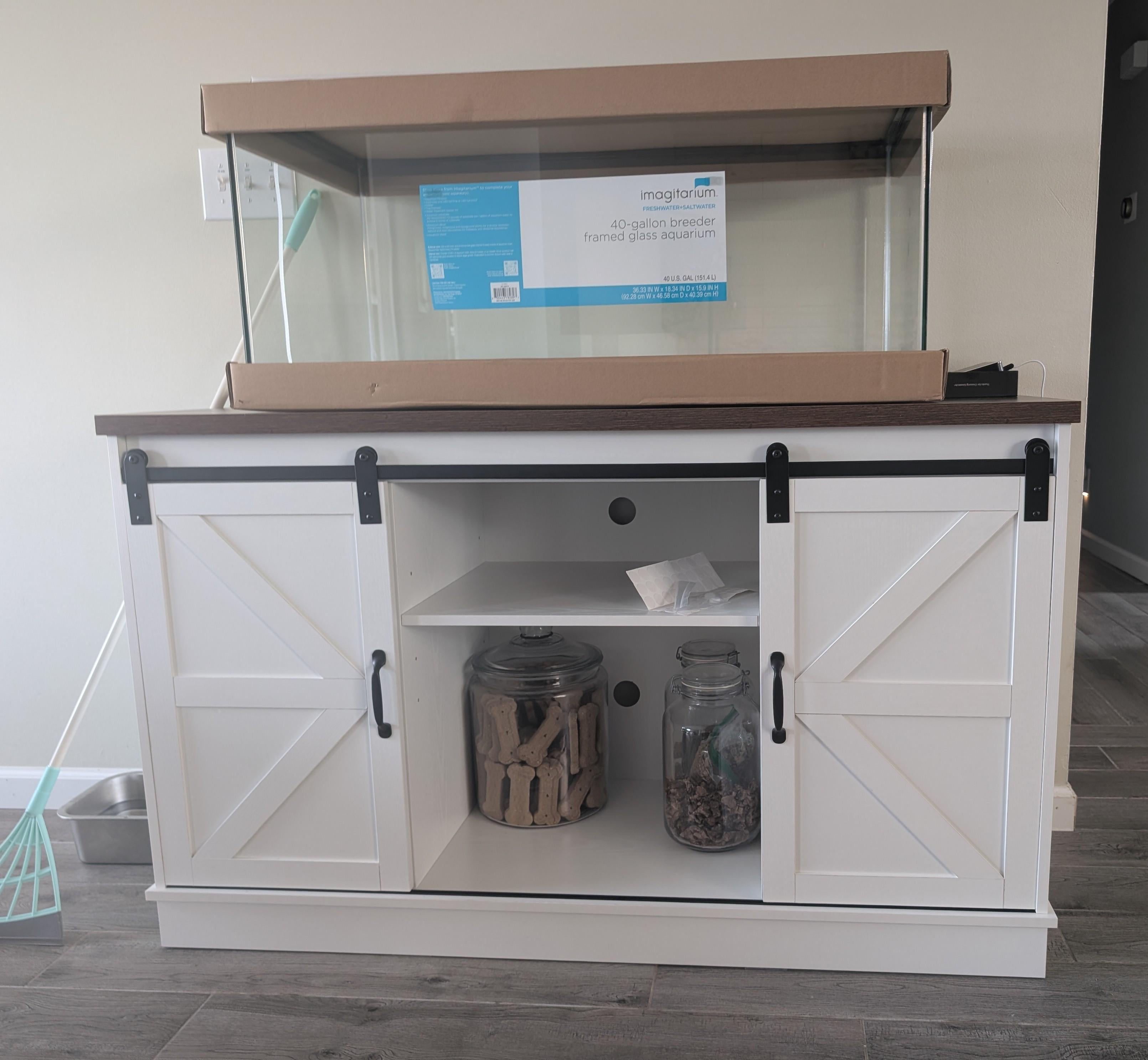 My partner surprised me with this cabinet and tank for Christmas. I asked if he'd like to get into the hobby with me and he said yes! So now he's researching adding a filter tank to the bottom shelf. Which is something I've never done before.