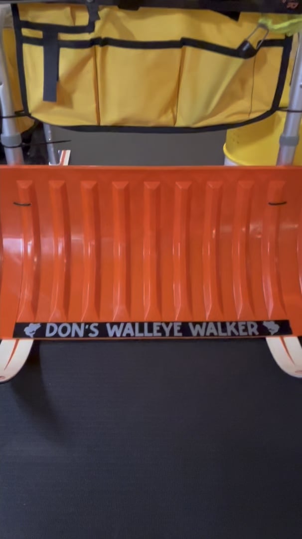 My dad is turning 80 and loves ice fishing, so my brother and I built him an ice-fishing walker out of old skis and fishing gear.
