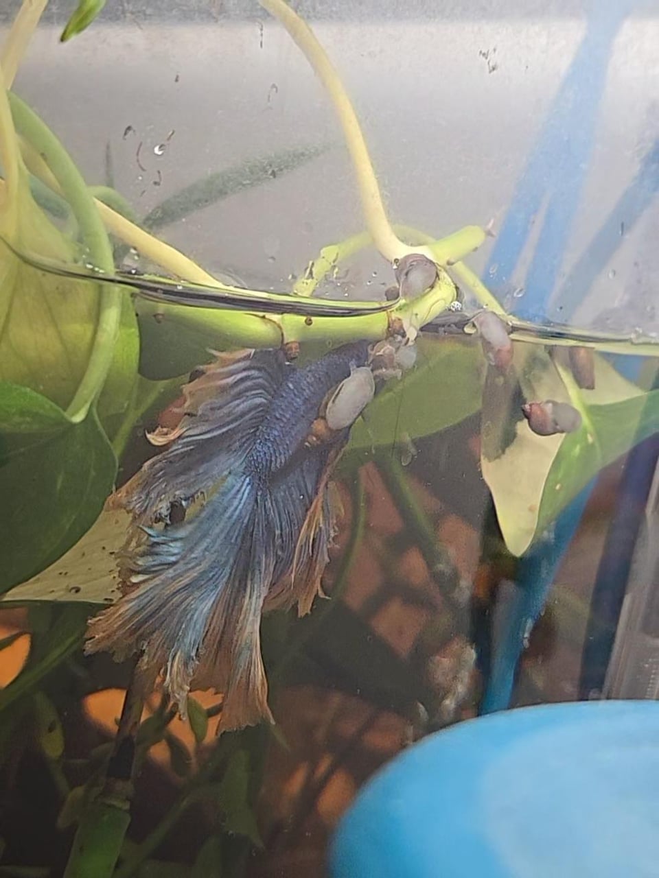I noticed a few white spots on my betta this morning. I checked him on both sides as well as top down and I didn't see the classic signs of ich but I'm not quite sure. There's one at the base of his dorsal fin as well as the ones on his face. I have some plants still in their containers to try and stop them from melting as much, could that be a cause of the injury?
