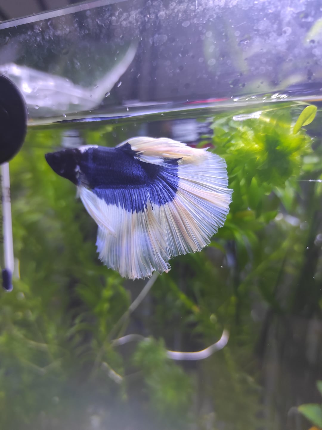 Hello everyone! I am a returning hobbyist who has had some Bettas in the past but took a hiatus from the hobby for a while. I have a 90 gallon fancy goldfish tank but was kicking around the idea of a planted Betta tank for some time when…well. I was at the pet store ACTUALLY just looking for plants, not expecting at all to find my literal dream fish right there. I have always wanted (and never kept) a blue butterfly half-moon, and guess what I saw sitting in one of the small display tanks? Exactly. The tank was pretty bare, the filter was strong and the poor fella rested kinda stuck against the overflow filter intake of said show tank. Besides that his fins weren't torn or damaged, his skin looked fine and all, but I knew the stress would get to him sooner or later, so I felt compelled to act quick…I basically set up the tank on a whim last night and immediately got him in there. Now I was lucky because I was able to use fully cycled sponge from my 90 gallon goldfish tank to basically provide a fully cycled filter from the get go, but I also added some starter bacteria to additionally jump start the cycle.