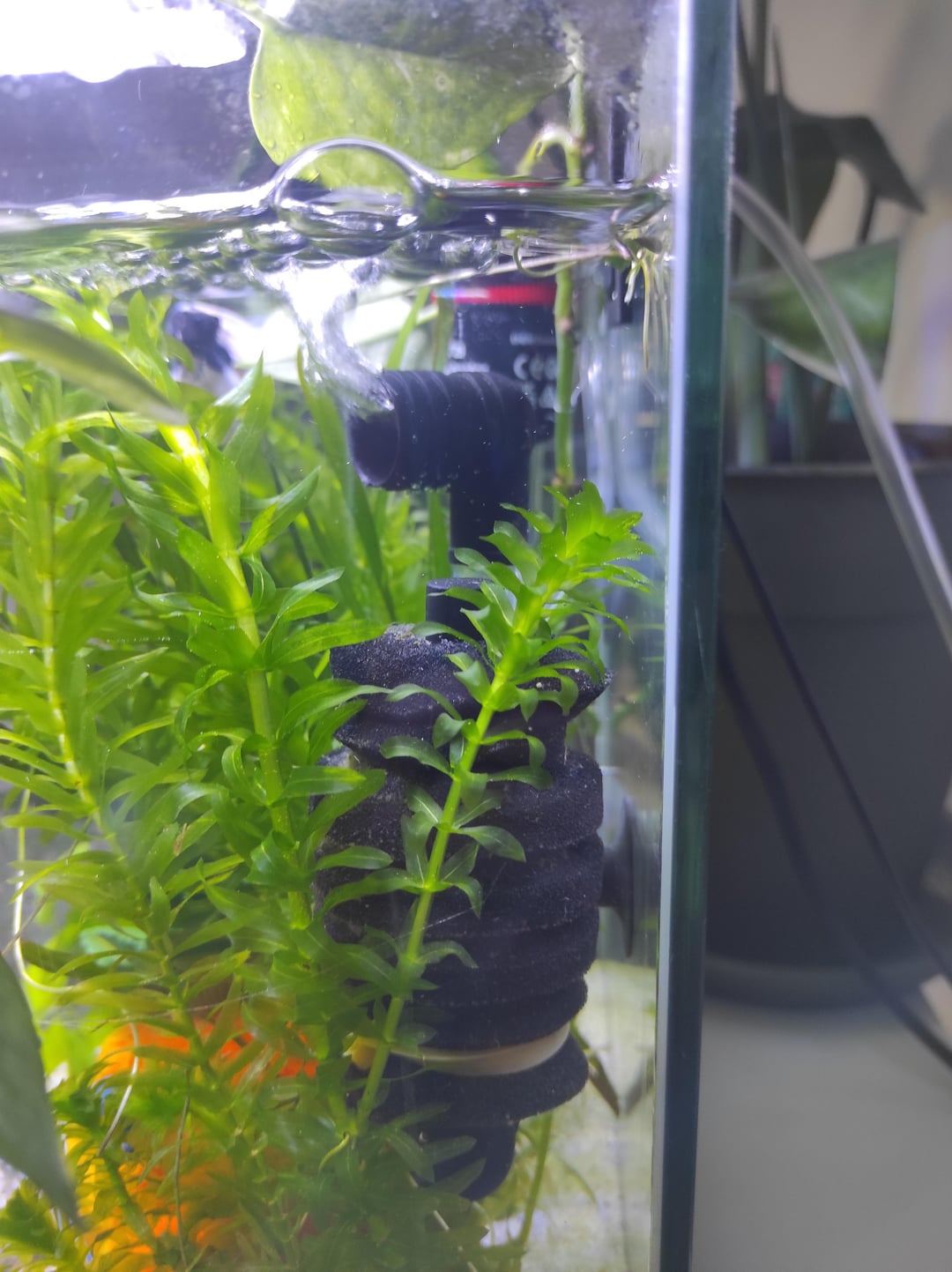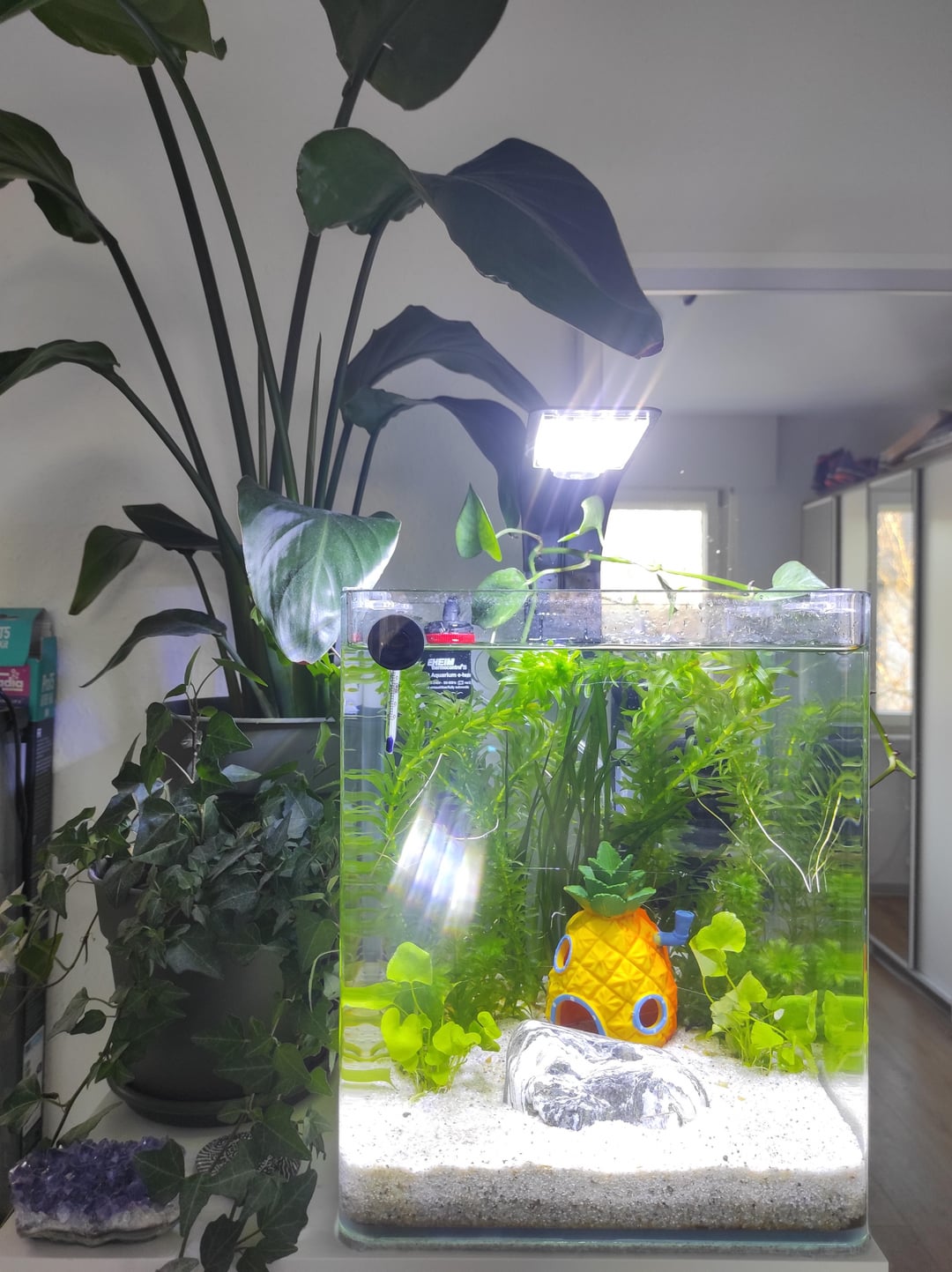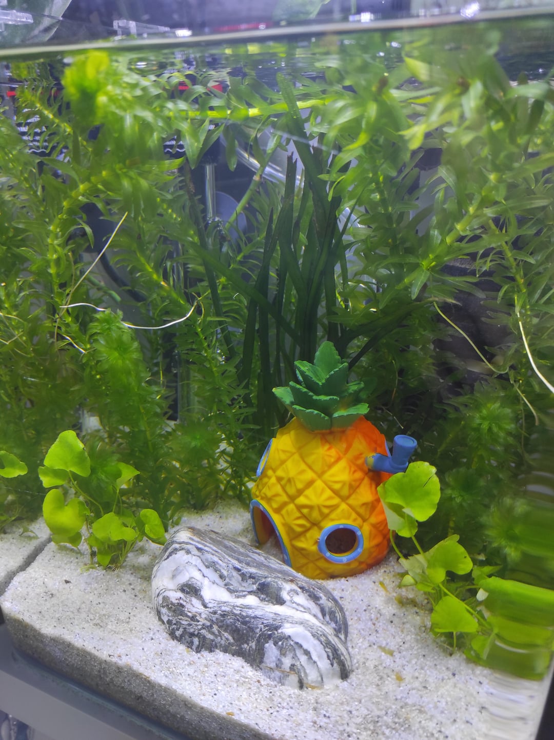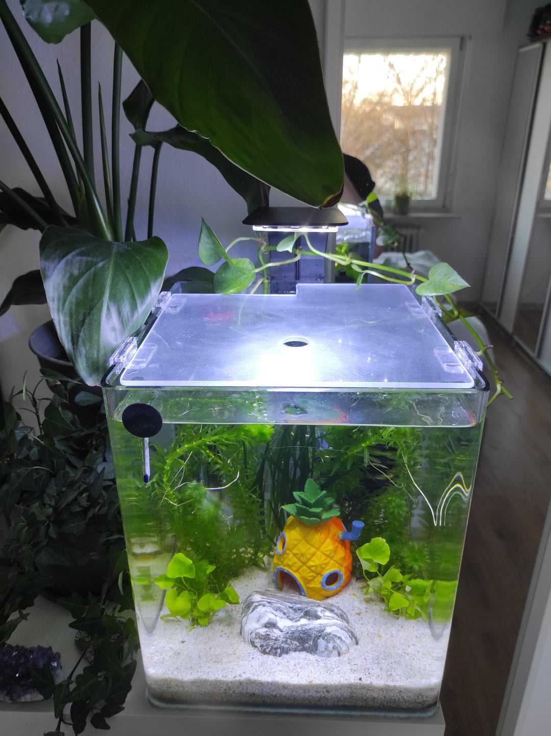 So this is my new boy's setup! I know cube type tanks are not suuuper ideal dimension-wise, but it's what I had to work with. It's a five gallon tank, with Egeria Densa, Vallisneria spiralis and I forget the name of the bigger leaved plant in the front…oops (some photos clippings at the top). I also wanna get some type of floating plant in the future to create more shade in the tank. There is also a photo of the lid of the tank attached. The filter is a small air pump driven sponge filter. Eheim heater is set to 26 °C. Little SpongeBob hideout is kinda corny but I got it as a well meaning Christmas present for my goldfish (!! can you imagine lol), sI realised it was the perfect size for a betta, I sanded down any rougher edges and made sure the windows are big enough for him to easily swim through.