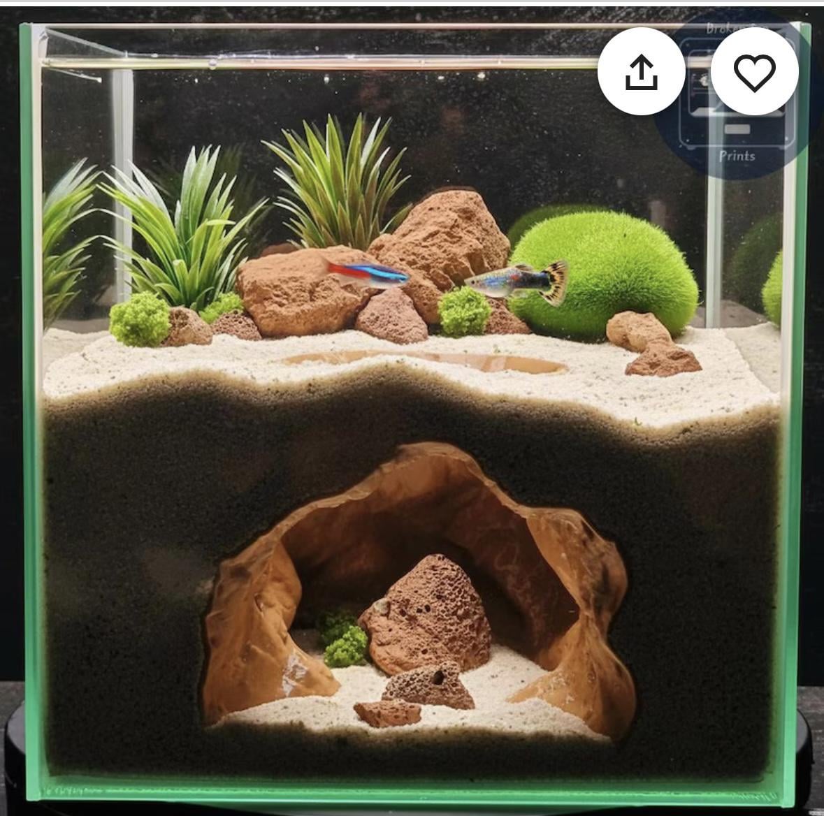 I feel like this leaves no swimming space (or water volume in general) for the fish. While bettas do appreciate hiding places, they dont dwell amongst rocks and in caves. Kuhli loaches and maybe corydoras would probably like this though! But for a betta a heavily planted jungle tank is a lot more appropriate. 🙂