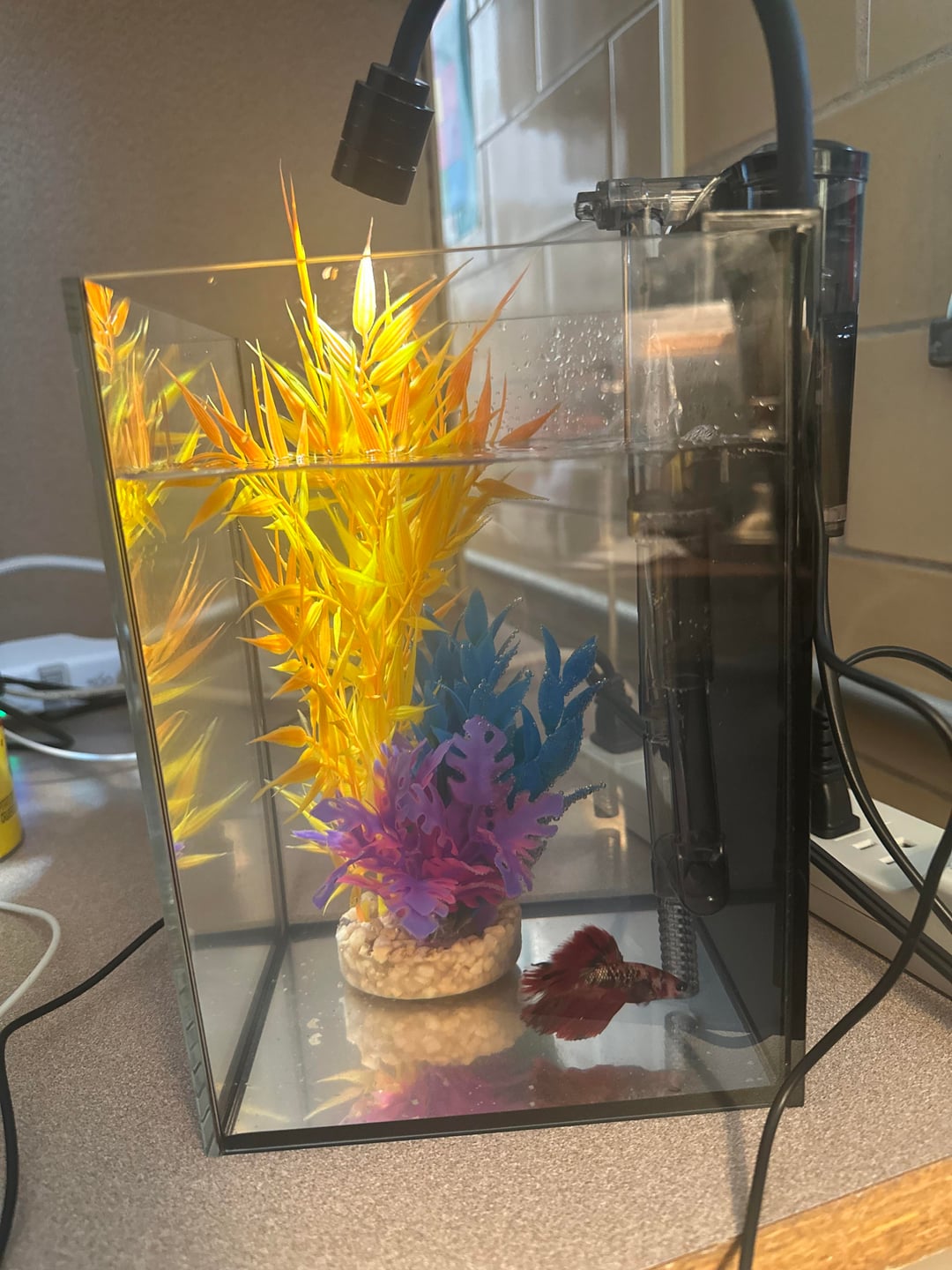I was gifted this betta for Christmas by my (very well intended but uninformed) boss in a 1gal tank, no substrate, or heater, he had a small plastic plant and filter.