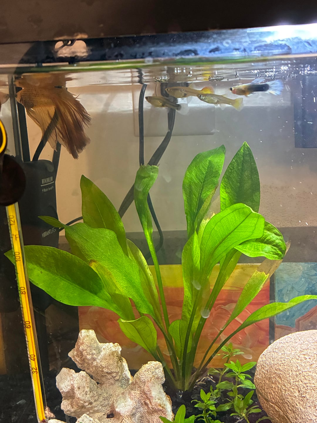 Decided to get a few fancy guppies over the weekend, including one male turquoise for potential breeding, thought two of the fancies might already be pregnant . I already knew My betta Andrew is super friendly , so his behavior is pretty much the same but he is a little more active knowing he has to share the tank now . Worst he does to them is literally push them away when they’re all up in his personal space 🤣