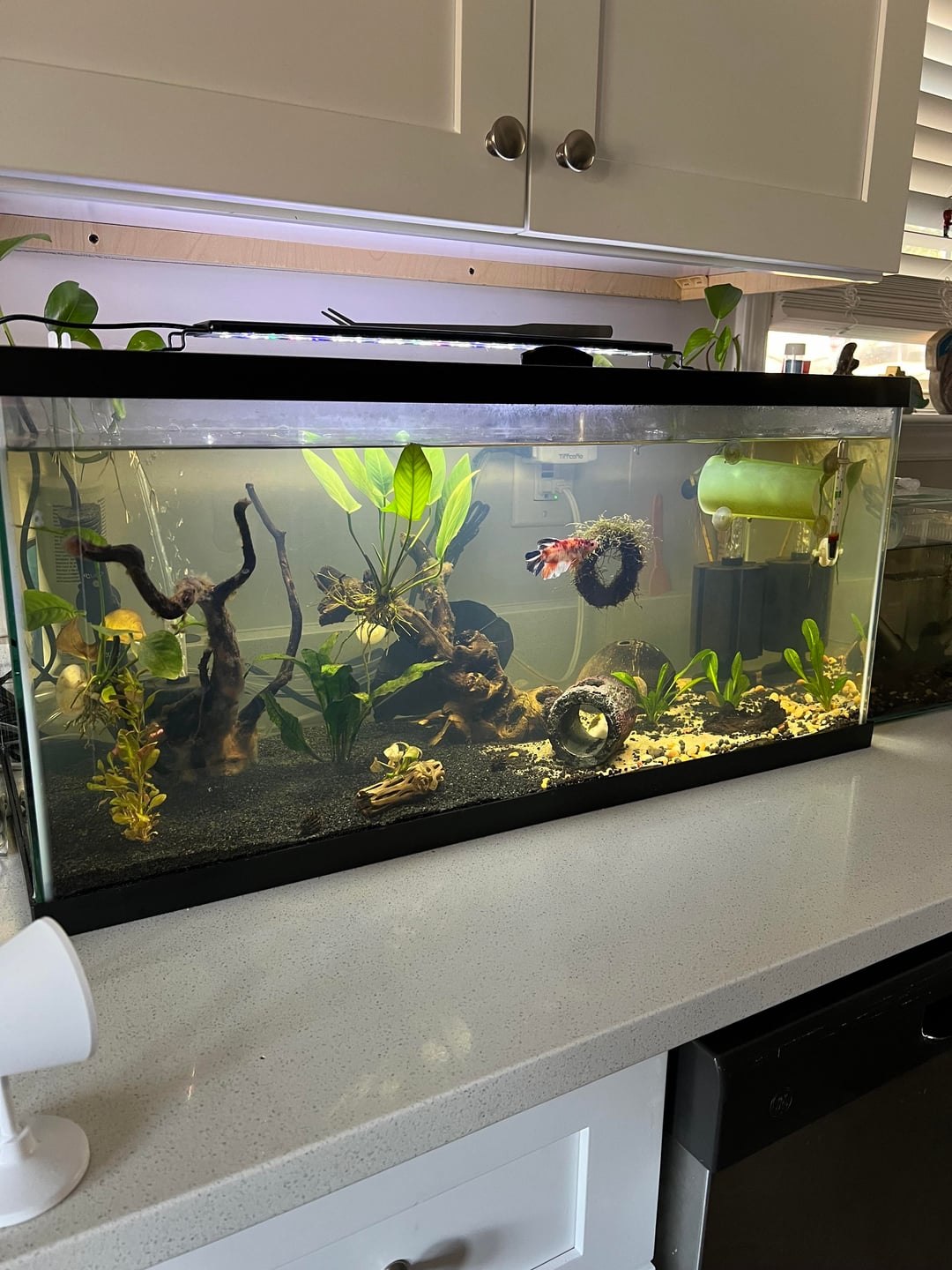 So I have a 20gal long with 1 male king betta. I was hoping to make this 20gal a community tank but my betta is not friendly! I have a 10 gal tank with 7 male guppies & 1 female betta. The female betta is not aggressive but I noticed the guppies fins have nips in them. I have watched the tank to see who was doing it and it seems like all the male guppies are doing it to each other.. I thought it might be a good idea to switch my guppies and female betta to this 20gal and switch my male king to the 10gal but I feel bad taking him from bigger tank.😭 I have four tanks so I really don’t wanna get another 20gal… any suggestions on what to do?