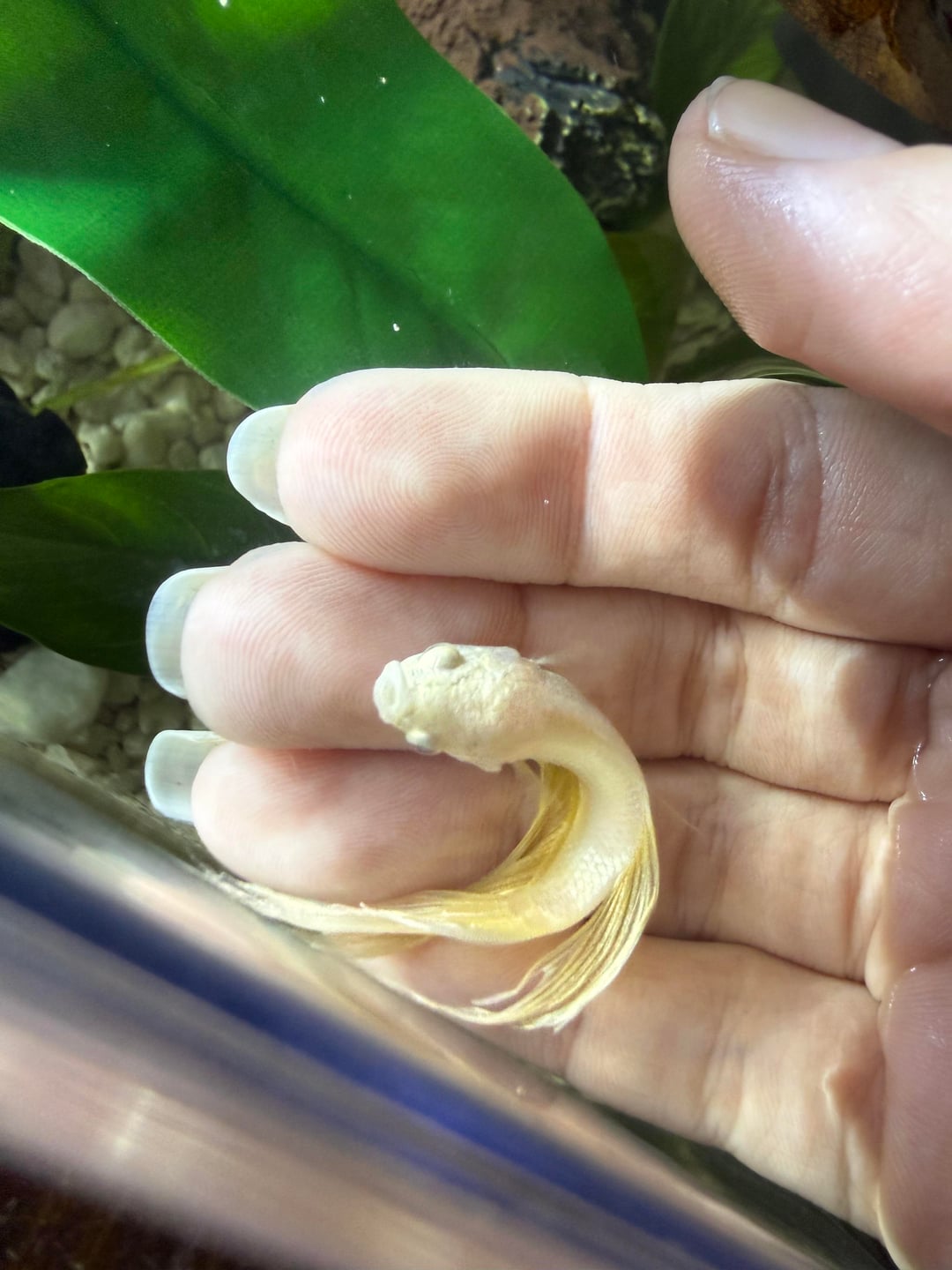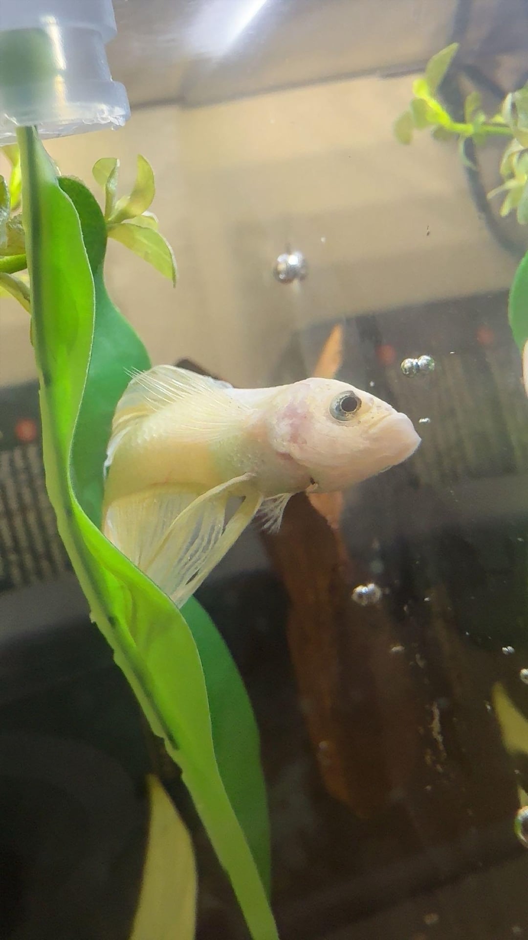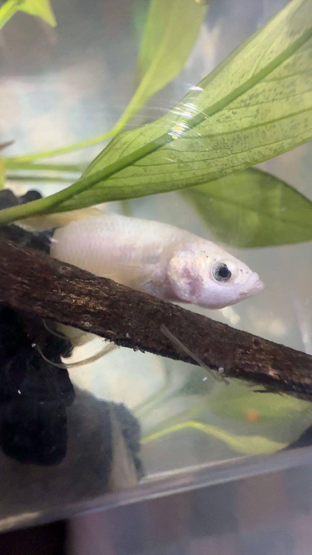 got this sick betta from petsmart, he was there for months and would only sit drooped over at the bottom of the cup. i got him and put him in a 1.5 planted tank with lots of leaf rests, where he would do the same for a bit but i saw progress everyday. he also couldn’t swim well at all. (why i kept him in a smaller tank for awhile) and ill be damned if he didn’t perk right up especially within the past few days!🥹 i’m so happy i was able to help this guy. he swims so strong now and will jump up and grab food off my finger! he’s made such a huge turn around and im so happy i can move him into his bigger tank and wanted to share how happy i am. i really thought at first that he wouldn’t make it. he’s in a 3gal now, and im currently cycling a 5gal for when he’s 100%. now i still need a name 😵‍💫