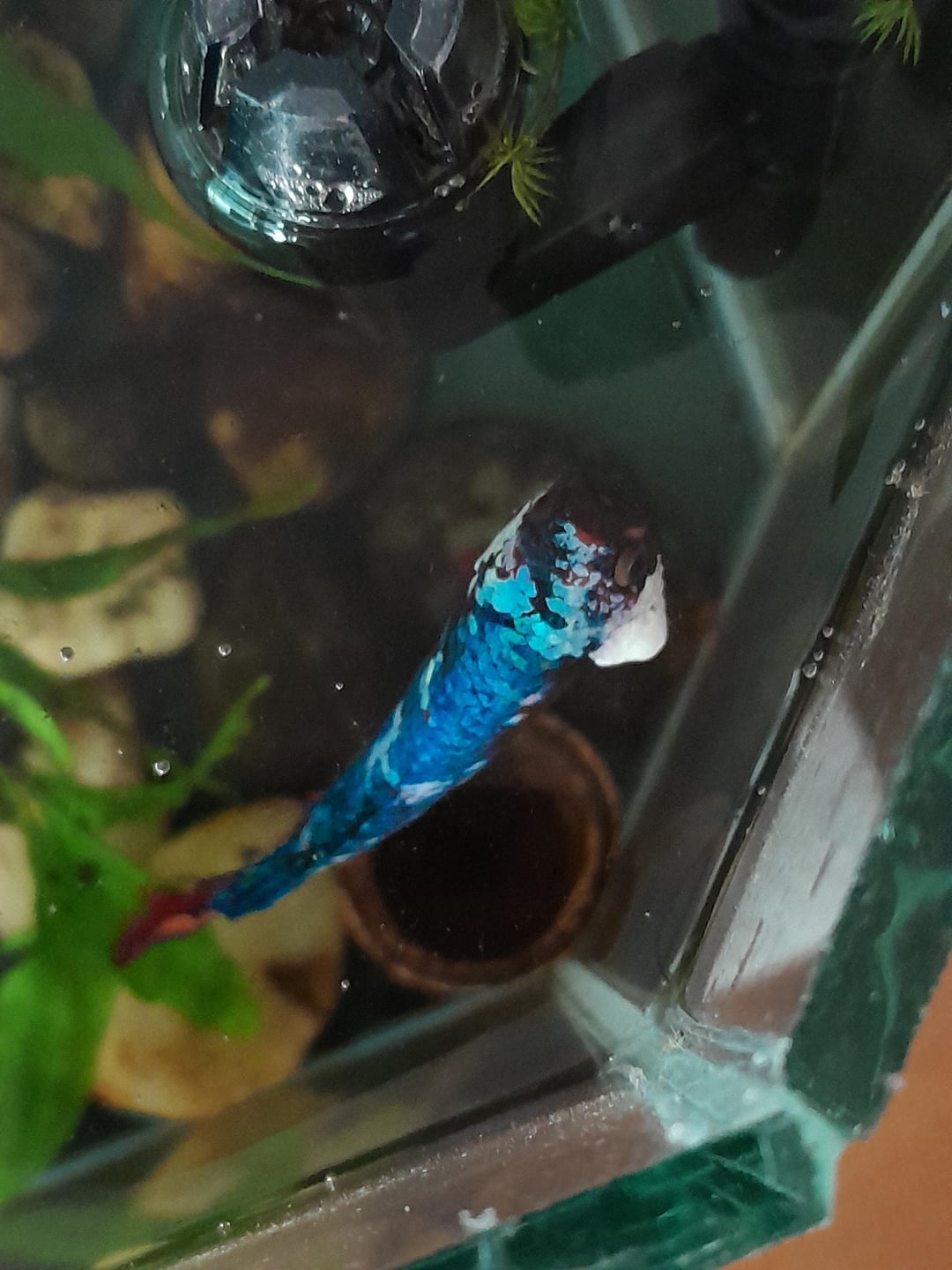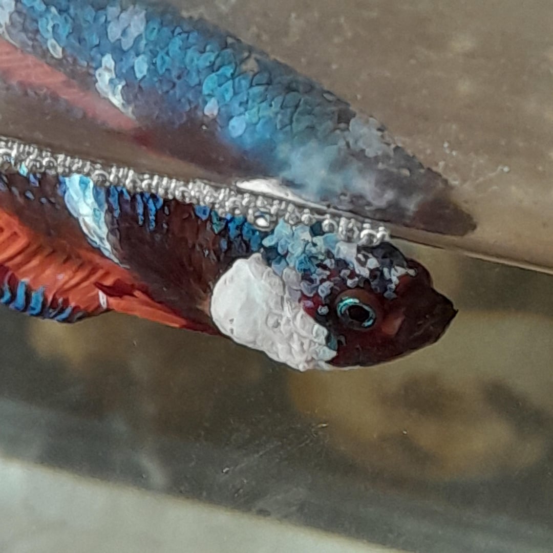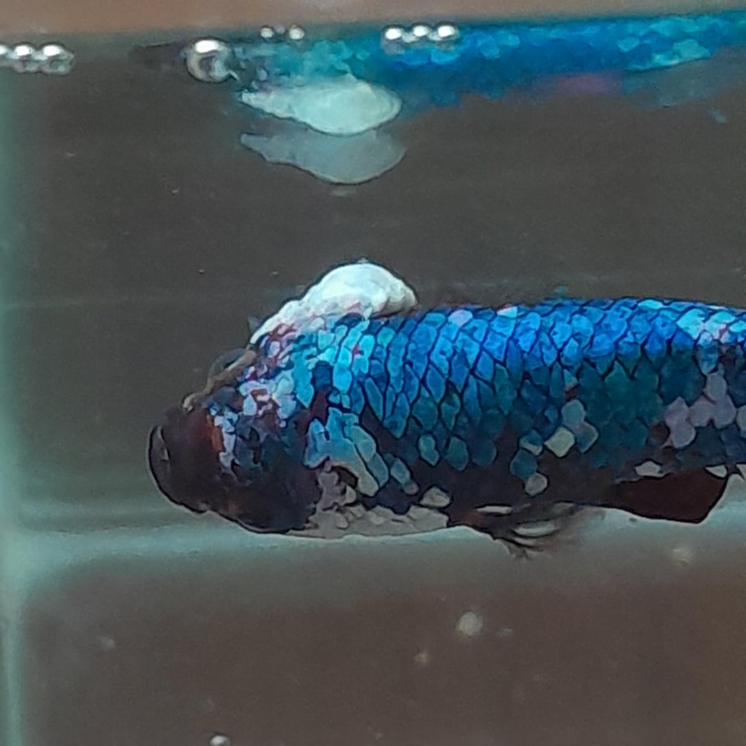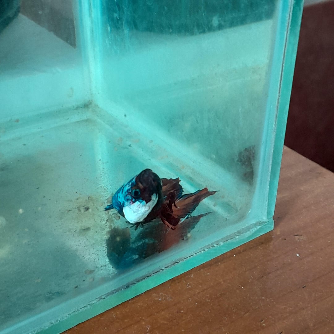 First time betta owner here! I have had this boy for about 10 months now. Our family is familiar with other fish but this is our first time adopting a betta. This lump on his right gill started appearing two weeks ago. I clean the tank and dechloronise, do everything I can thinking it is infection. But it doesn't disappear or reduce in size. He is fed once a day for every day and sometimes twice every 3 days. His tank is 5.5 gallons with big java fern in the middle of tank. The aquarium salt is added every time water is changed which is every 10-15 days. It has filtre but not heater because I live in tropical country where these guys are native. The weather is already hot enough that I sometimes even have to lower the water temperature. He has been swimming less quickly lately and sometimes just lying at the bottom(last pic) or just staying like a stone near the surface(3rd pic). His tank in the last picture looks smaller because he is in temporary tank since his usual one has to be rescued from small worms (I don't know what those are). I am thinking maybe because of those lil worms. He does eat every time I feed him though. I don't want to lose him just in case this is a big problem. Please help me out.
