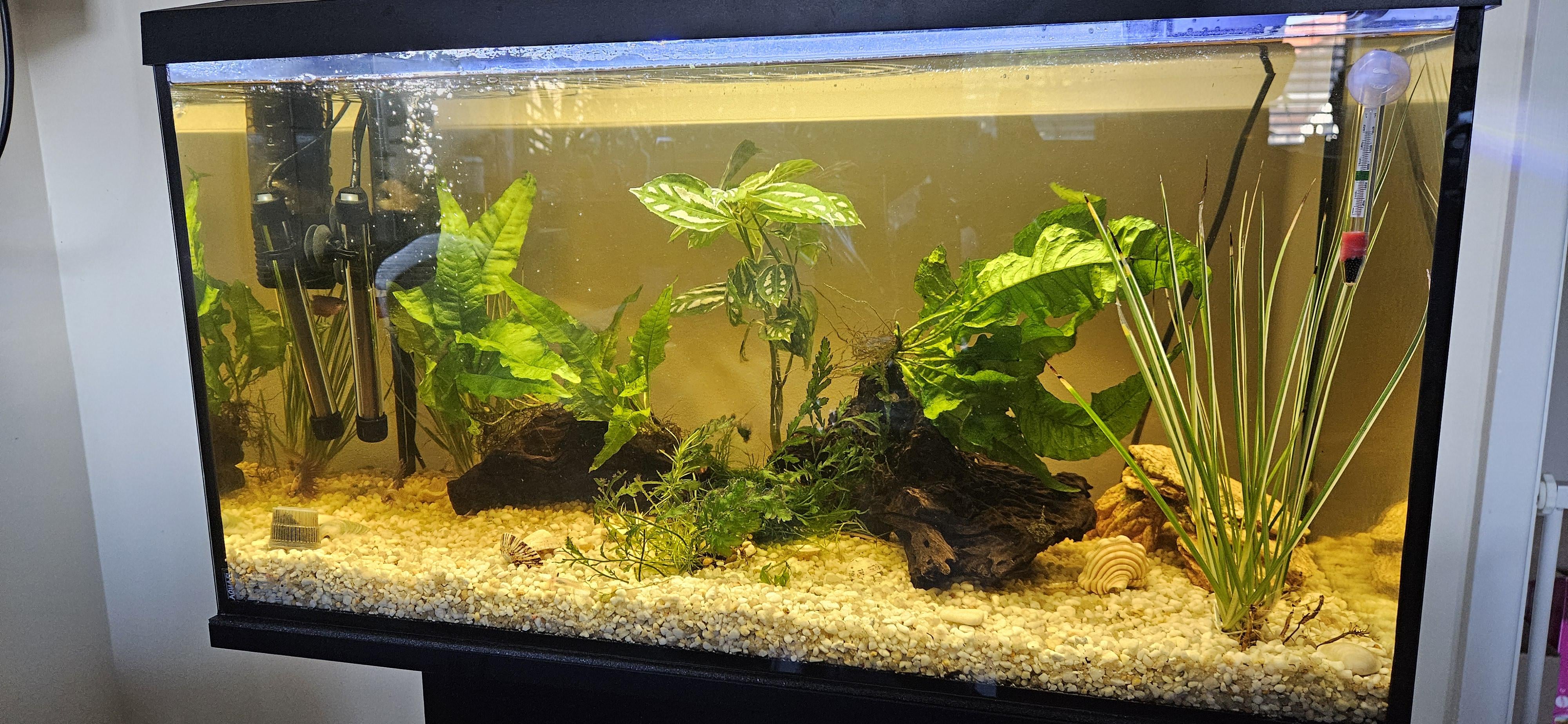 You have quite the mix of fishes. Sometimes it’s better to stick with two or three types of fish in a small aquarium, to make it look more natural and calming.