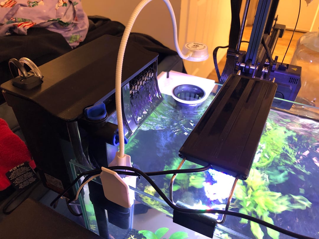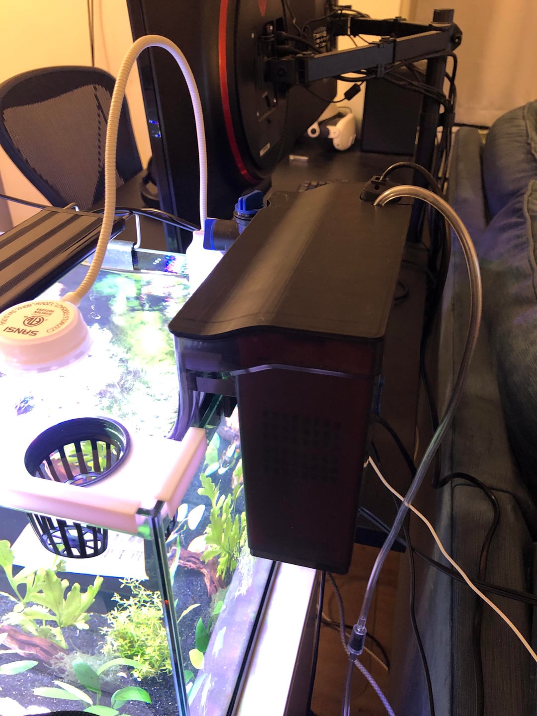 3d printed a lid. Had enough room to stuff a water heater and an air stone into it. I also 3d printed a cage where I put a small polishing filter. This particular HOB also has UV built in. It’s pretty nice not needing any other tubes or wires going into the tank.