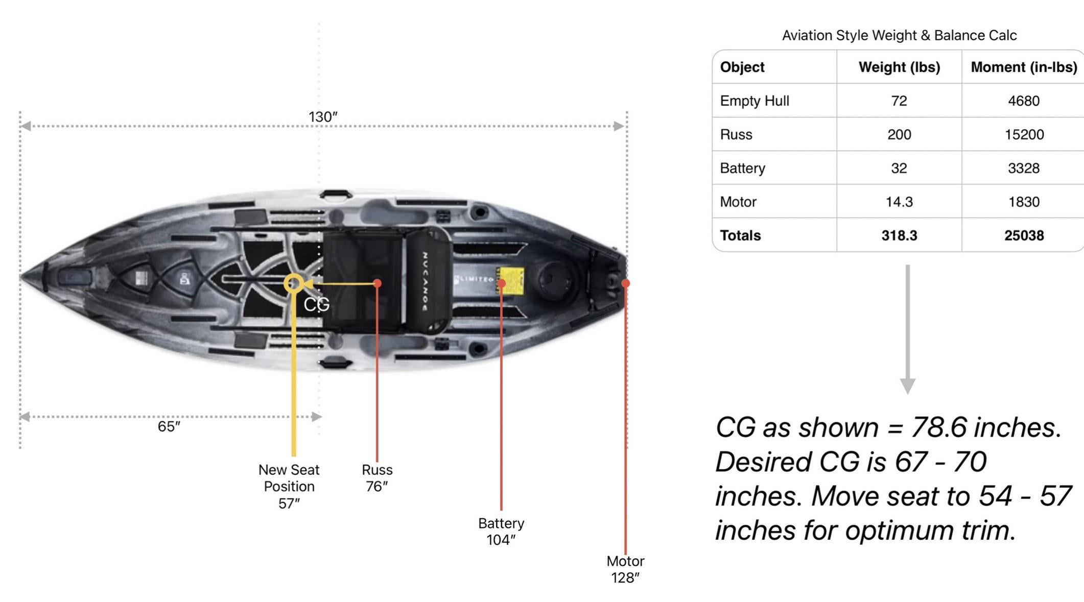 How big of a deal is weight distribution in a kayak when it comes to its performance in the water? I know you can trim the motor on a regular boat to improve performance but obviously I won't be trying to get my kayak "on plane". Still feels like it would at least affect battery life. I did the attached drawing in my effort to calculate the effects of seat placement on the center of gravity. What is your real world experience?
