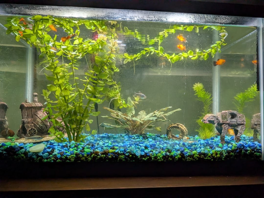 This tank was purchased one year ago and we have very slowly been adding fish and replacing fake plants with all live plants. That was a game changer for our friends, they are even more active and happy 😊