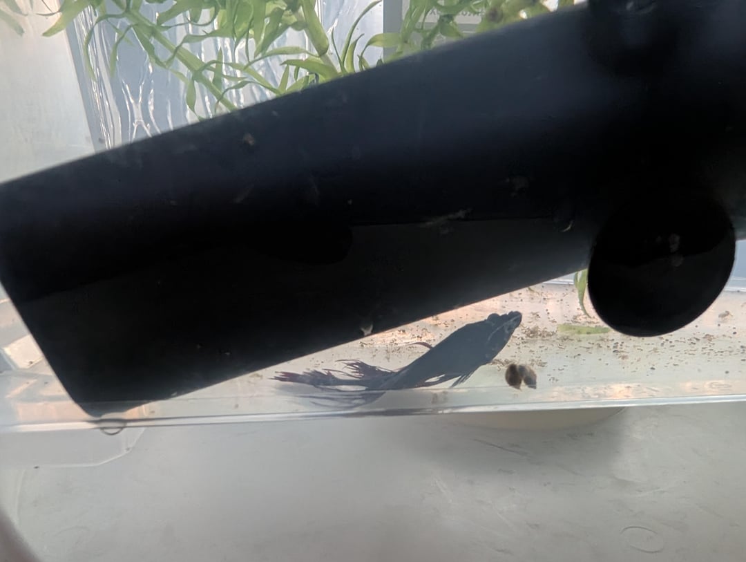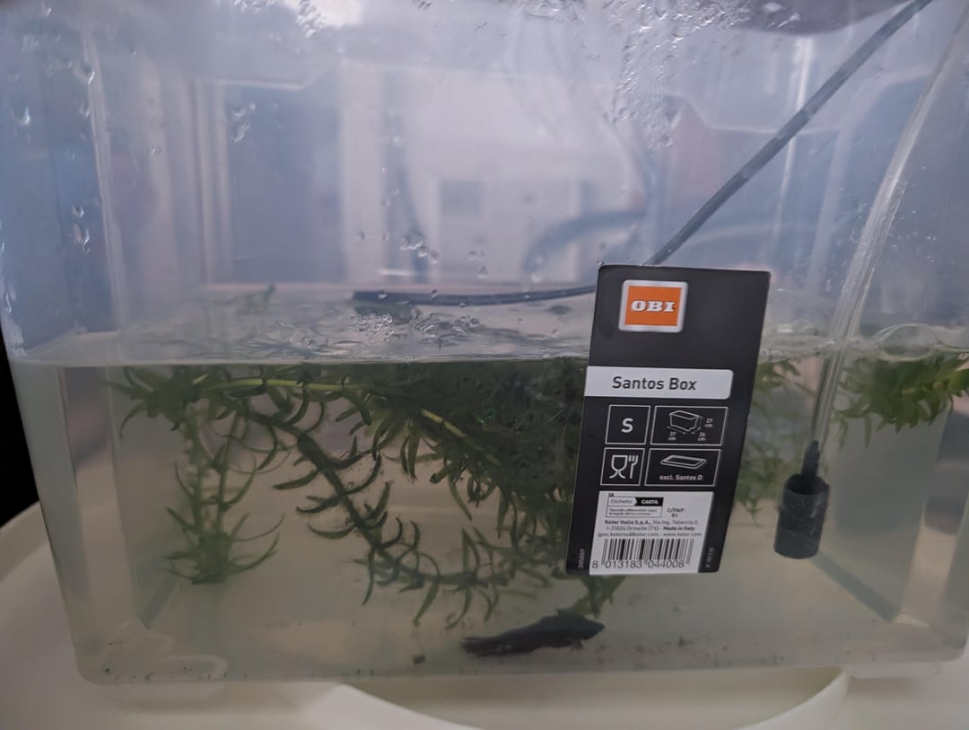 Still I decided to take him out and put him in the quarantine tank out of fear that there could be something harmful in the water that can't be measured. His quarantine setup is a 20L tub, bubbler and heater. The tub is not completely filled so he can reach the surface more easily.