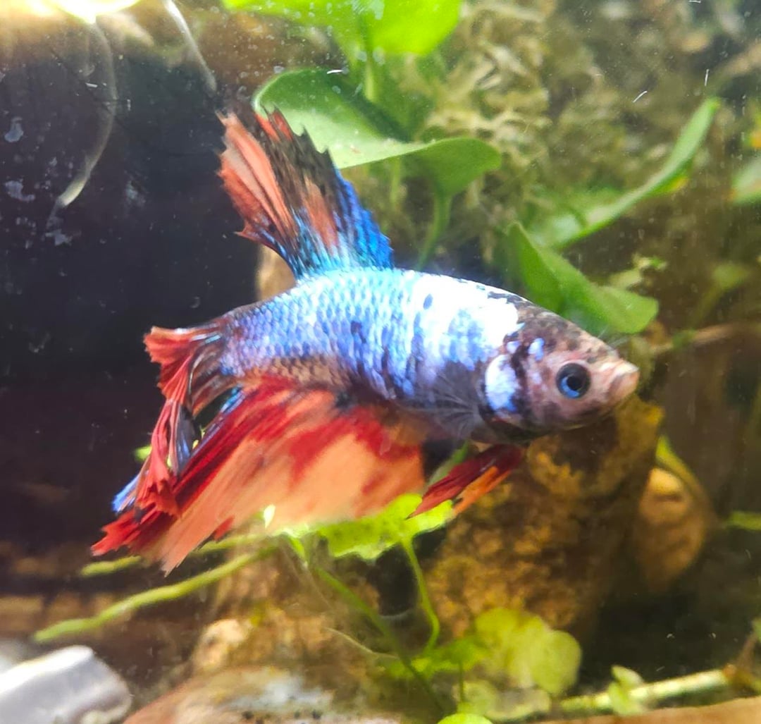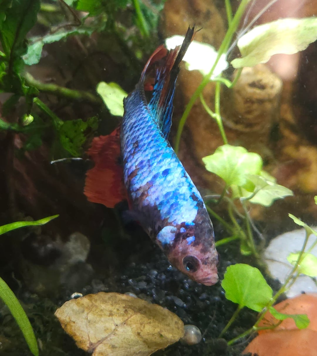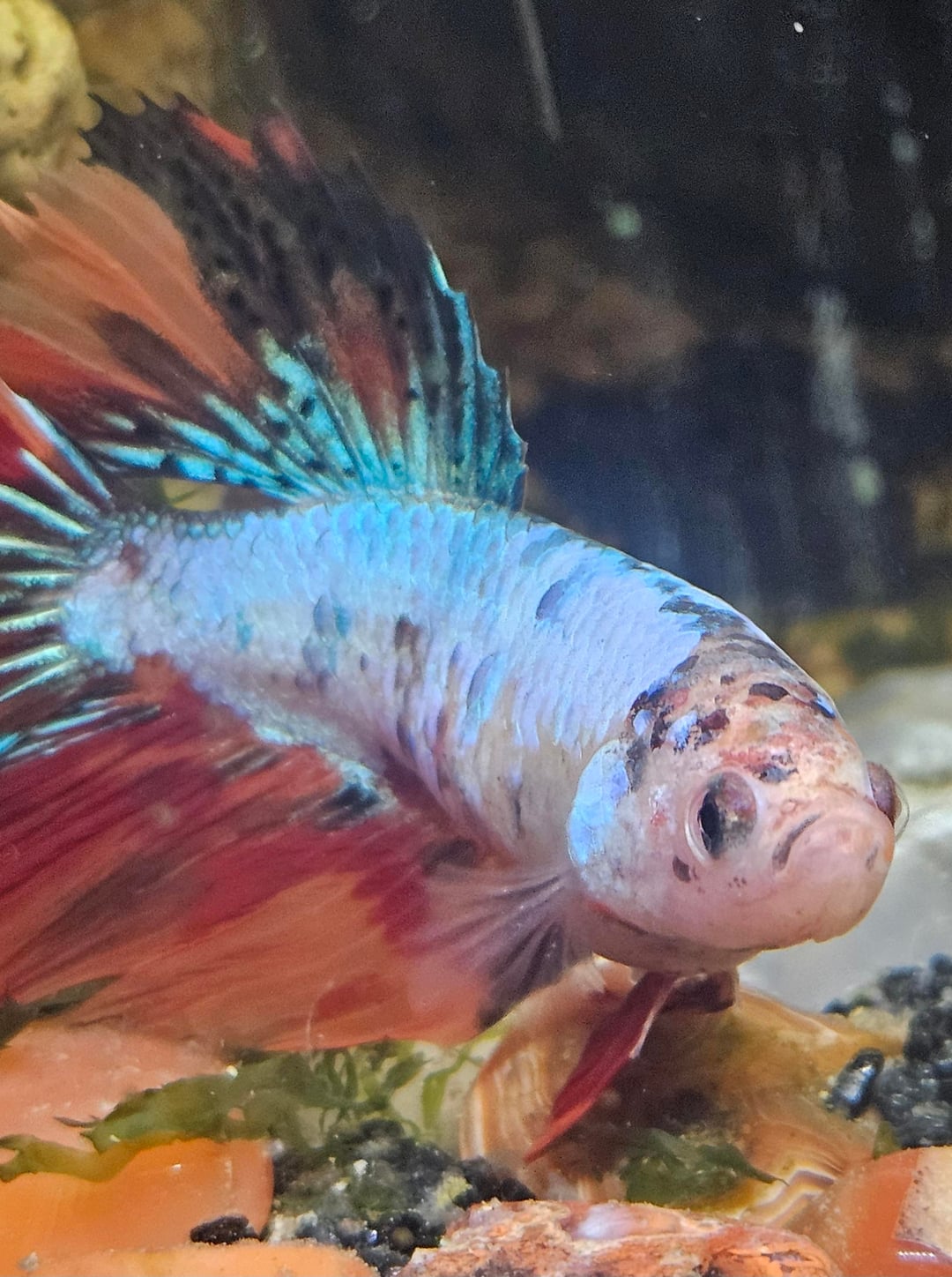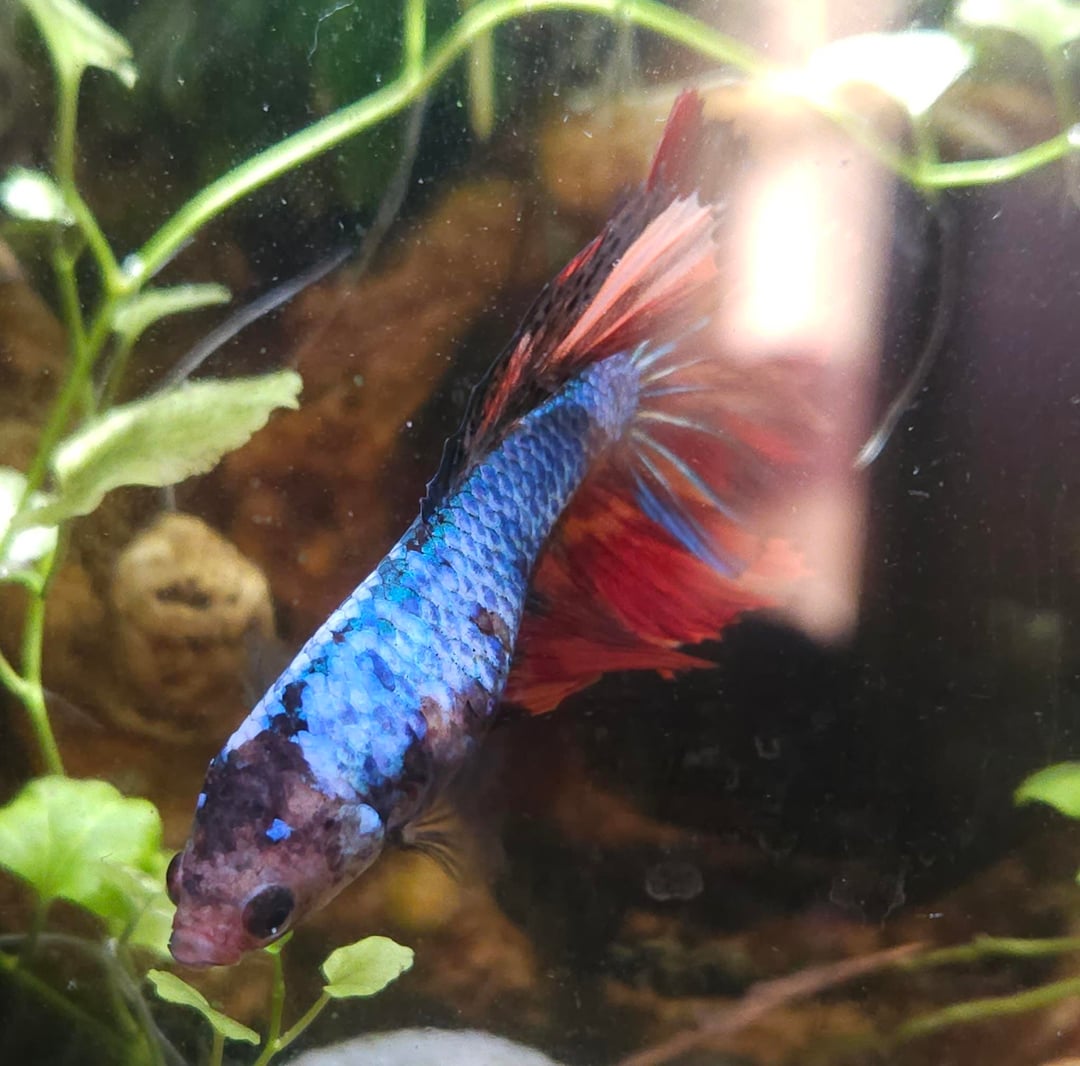 Today vs the day I got her. I had no idea what coloring to expected as she got more comfortable, and I'm loving watching her bloom. She has a bit of fin rot that I've been treating with daily salt dips, water changes, and stress coat. I think it's gotten better, although the colors in her tail make it hard to know for sure.
