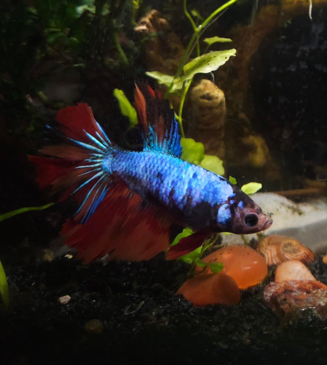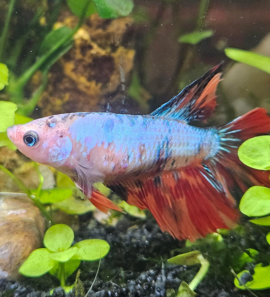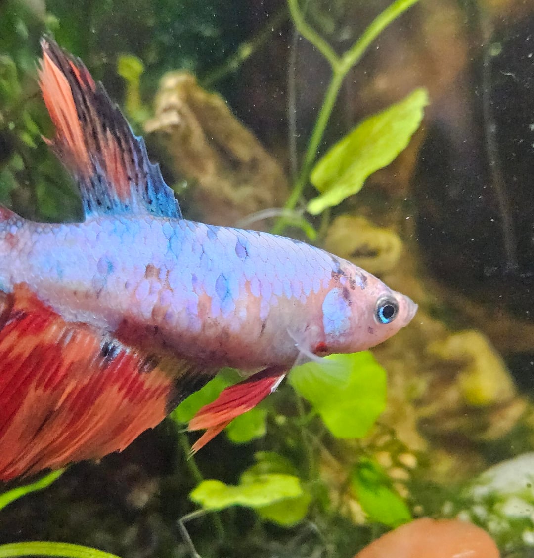 Today vs the day I got her. I had no idea what coloring to expected as she got more comfortable, and I'm loving watching her bloom. She has a bit of fin rot that I've been treating with daily salt dips, water changes, and stress coat. I think it's gotten better, although the colors in her tail make it hard to know for sure.