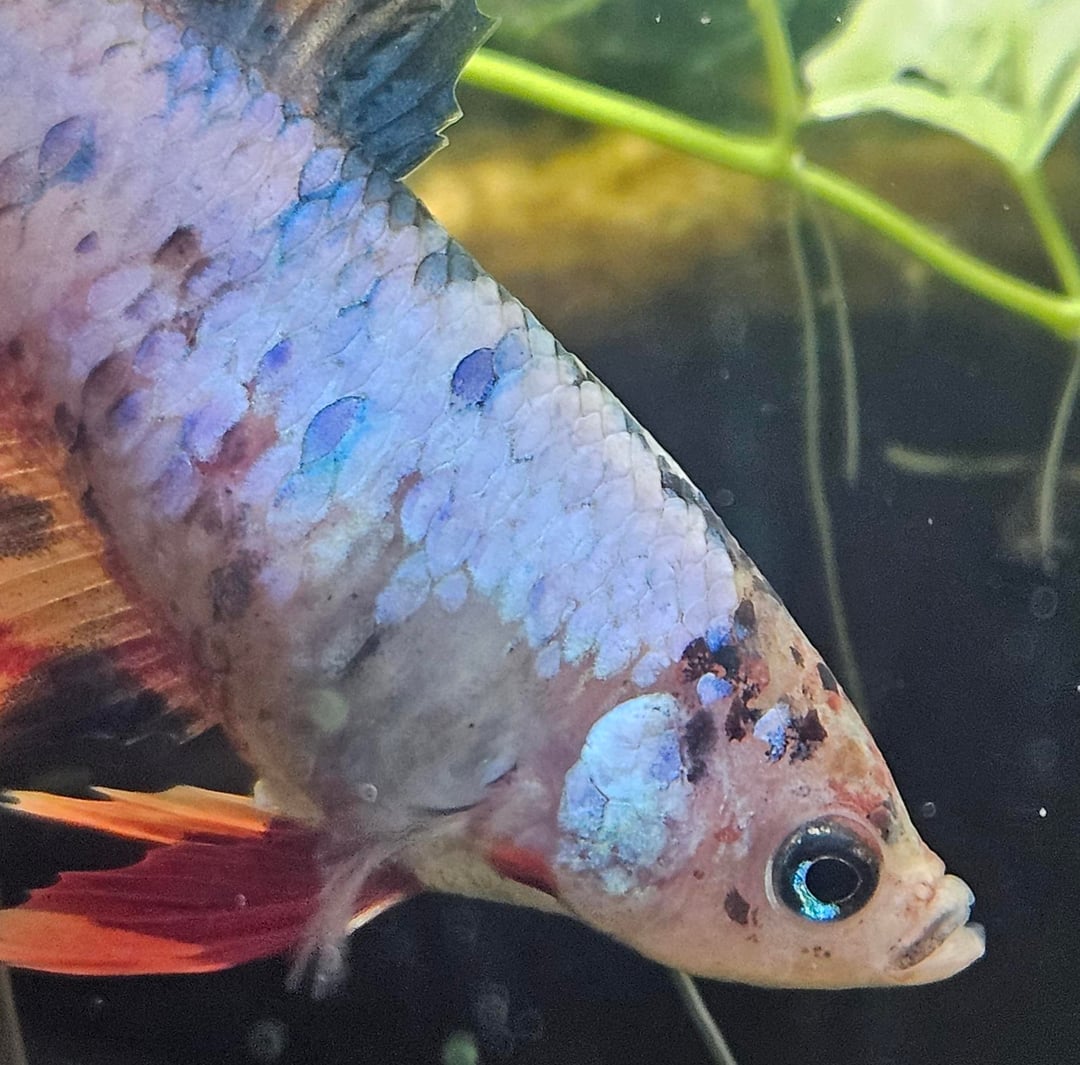 Galatea is a female fancy marble halfmoon. She's not a giant, although she's the biggest female betta I've ever seen. Buying from a broker/breeder (Coast Gem) was more expensive, but seeing the difference in body composition, coloring, and overall health of the fish offered through a betta specific vendor really opened my eyes to the damage we as consumers have done to betta genetics with all the sickly baby bettas growing up in cups on pet store shelves.